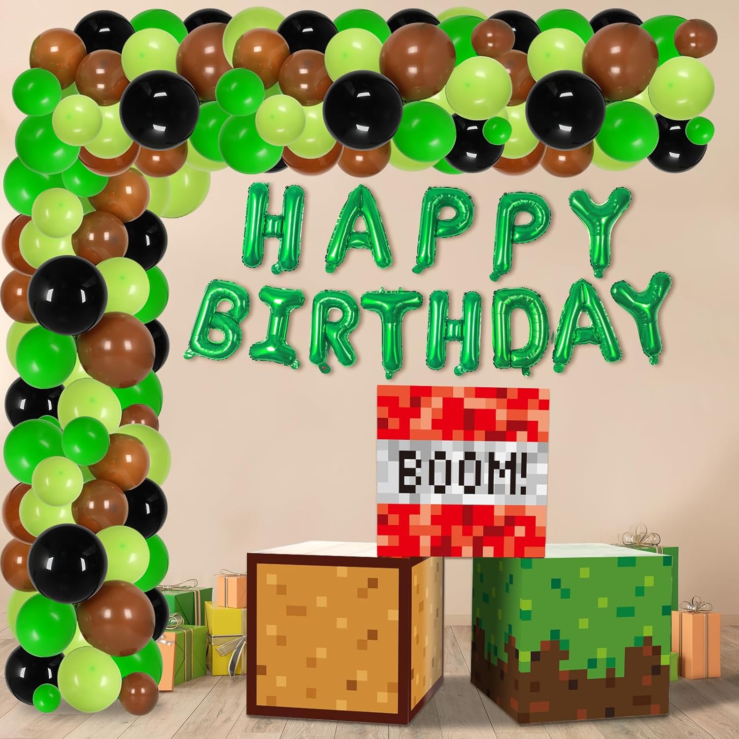 Package includes: Pixel birthday party supplies include 103pcs of balloon in 4 colors(brown, light green, green, black) and 3 sizes(12inch, 10inch, 5inch), 1pc of balloon strip, 3pcs of balloon box(red, brown, green), 1 roll of adhesive dots, 1 roll of ribbons, 1pc of “Happy birthday” foil balloons,providing everything you need to set the happy atmosphere for a memorable and fun-filled celebration.