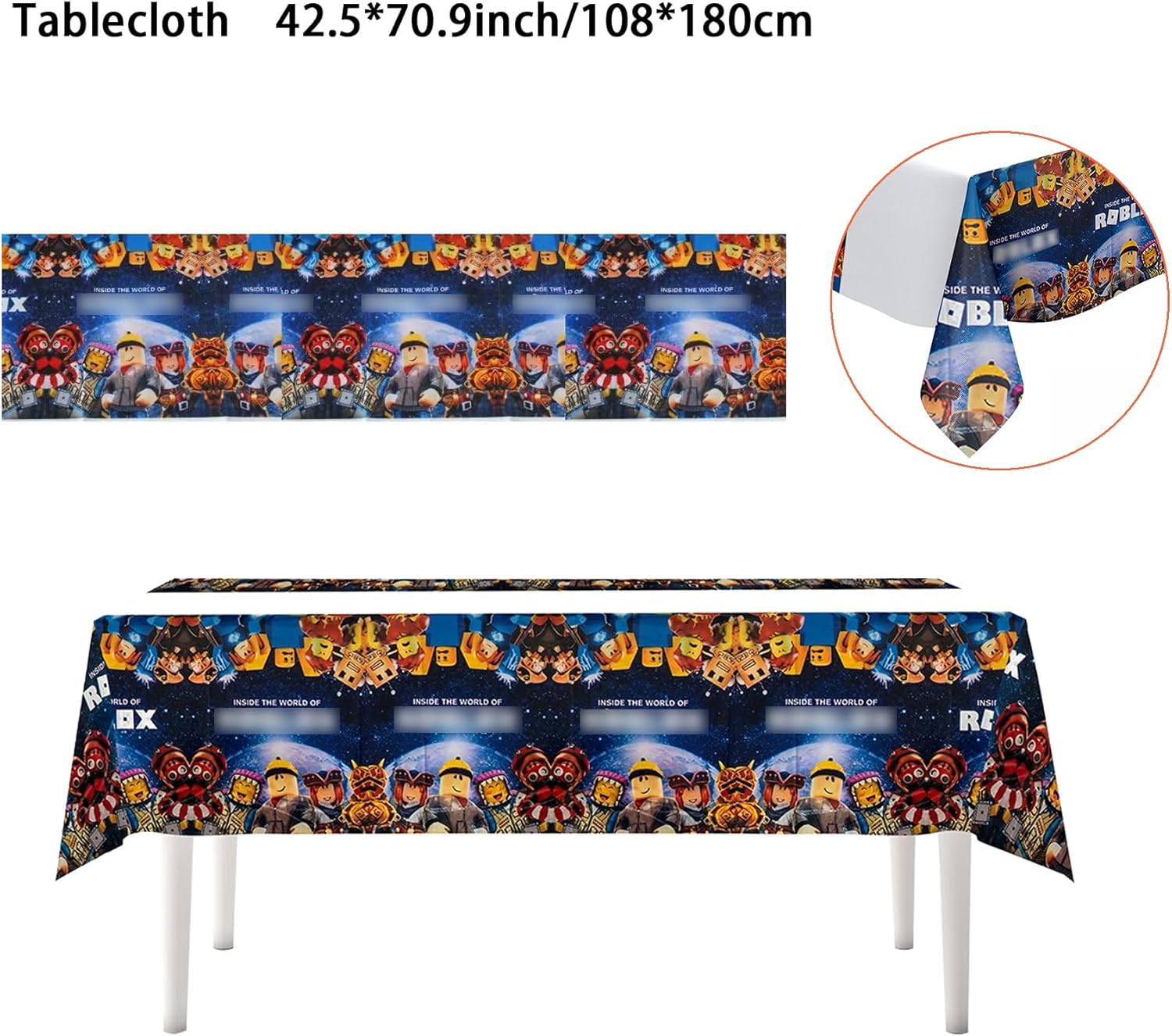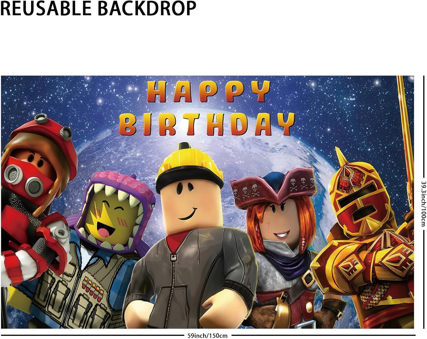 Birthday Decorations Set Includes: A game-themed birthday decorations set contains a happy birthday banner, backdrop, tablecloth, 6 hanging swirls, 24 cupcake toppers, 1 cake topper, 18 latex balloons, 2 foil balloons, 10 7-inch dessert plates, 10 9-inch dinner plates, 20 napkins, 10 forks, 10 knives and 10 spoons for a party