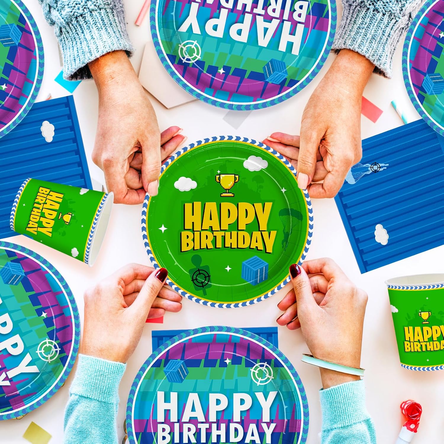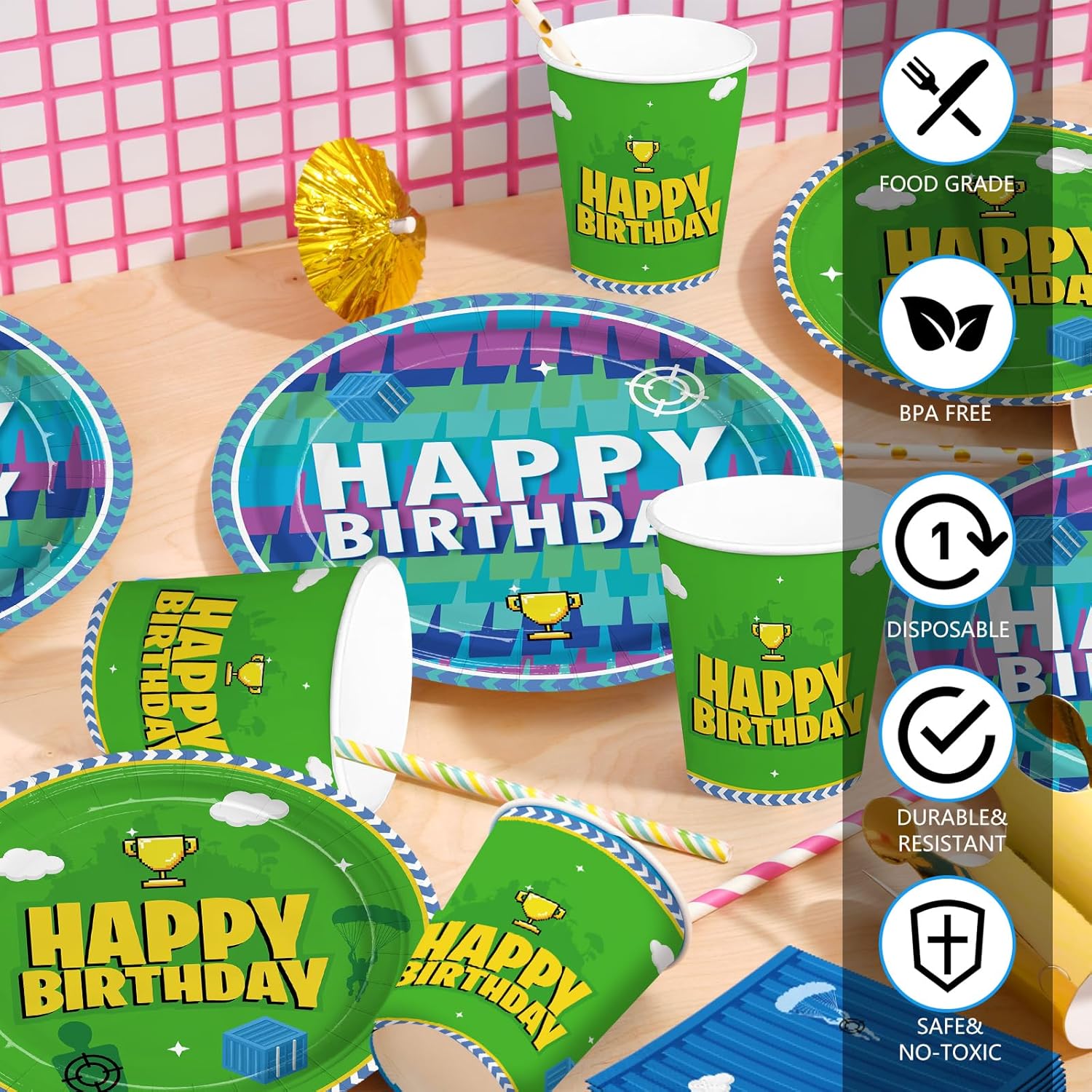Video Game Design: Our video game party supplies tableware set features a game scene design, they show the wonderful charm of the game world. Iconic gaming elements, and a playful layout, which leading you to immerse yourself in game reverie.