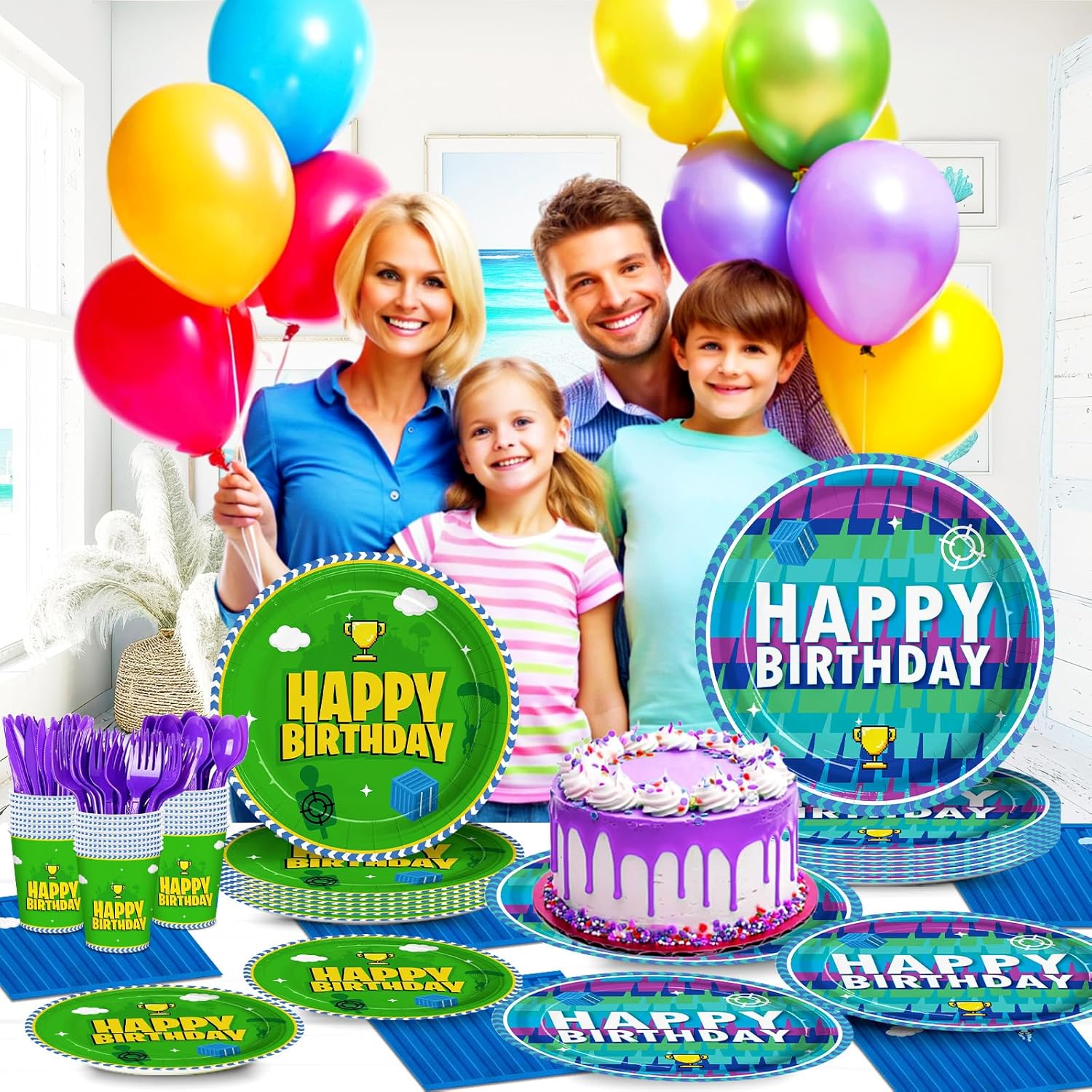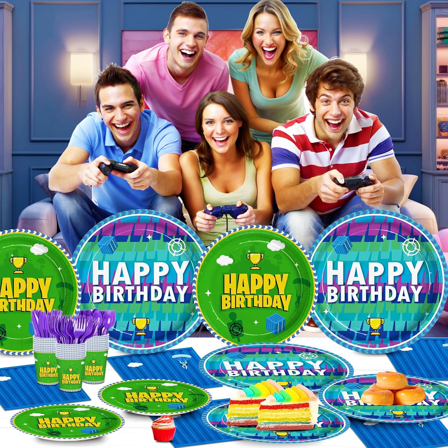 Video Games Birthday Party Supplies: Video game disposable tableware set includes 24pcs 9 inch dinner plates, 24pcs 7 inch dessert plates, 24pcs 6.5 inch napkins, 24pcs paper cups, 24pcs purple knives, forks and spoons that suitable for boys birthday party and enough pieces to serve 24 guests.