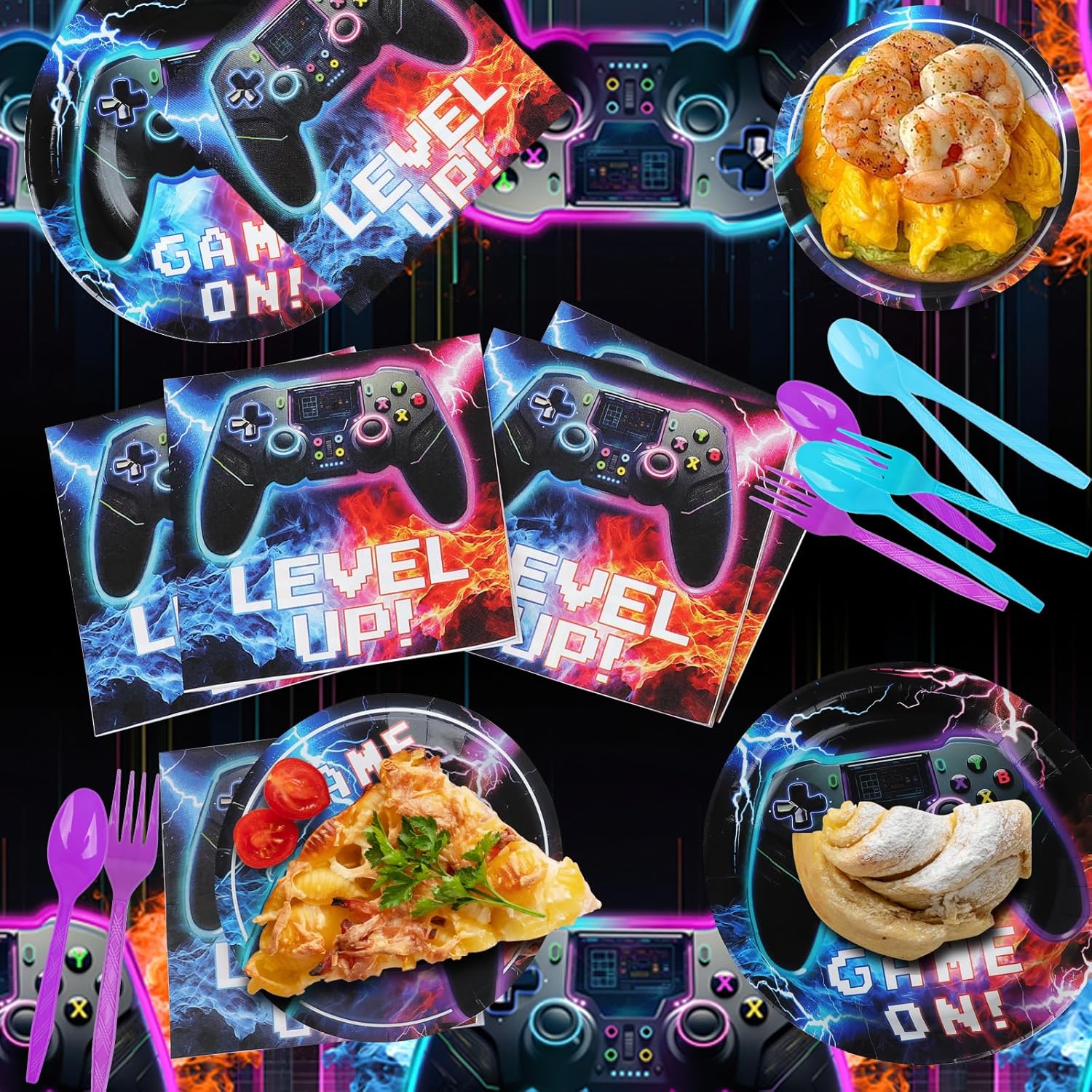 SERVES 24 GUESTS: This Video Game Birthday Sets has all you need for 24 guests, includes 24pcs 9” Dinner Paper Plates, 24pcs 7” dessert Plates, 24pcs paper Napkins, 24pcs paper cups ,24pcs forks, 24pcs spoons, 24pcs knives,1pcs tablecloth.