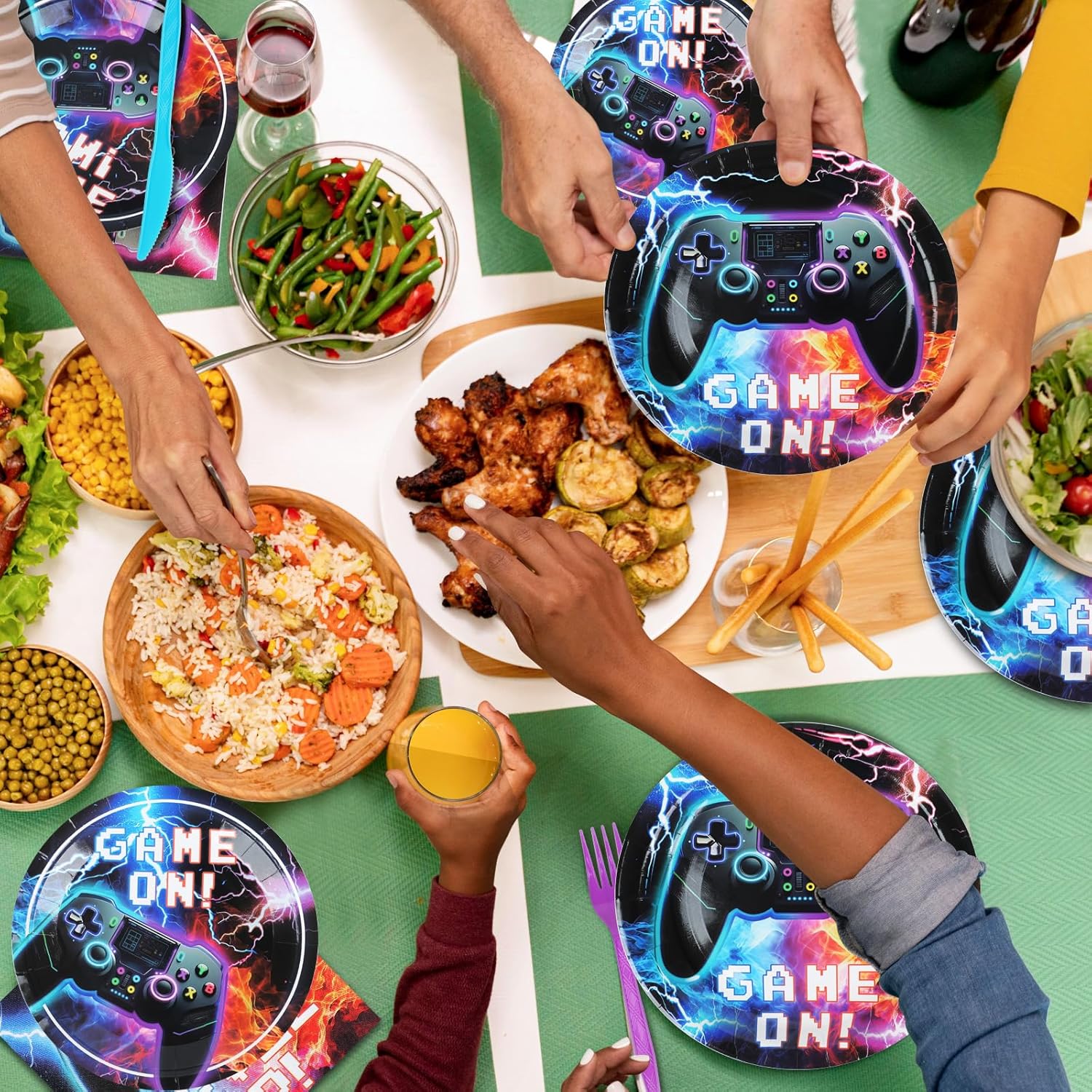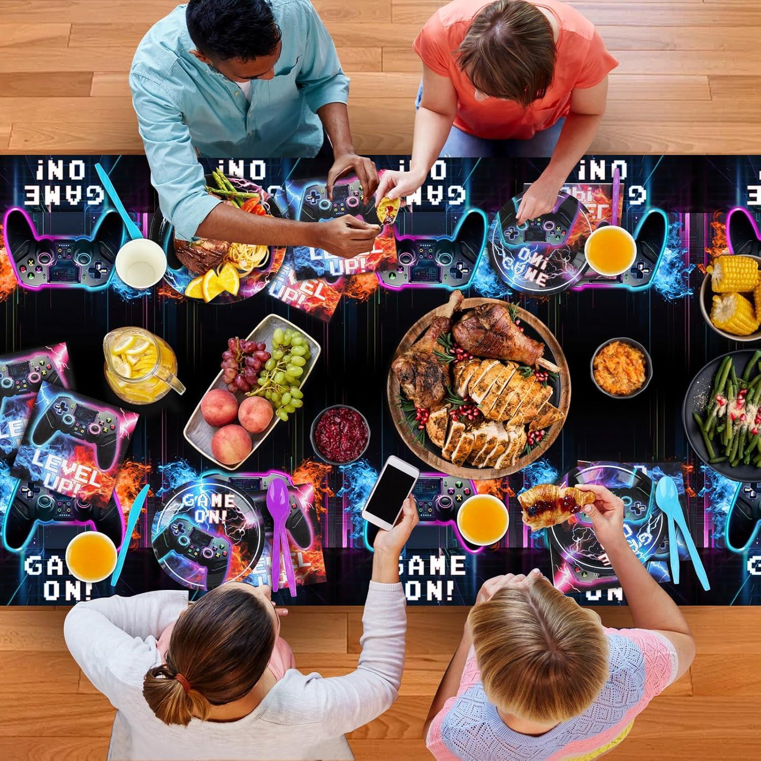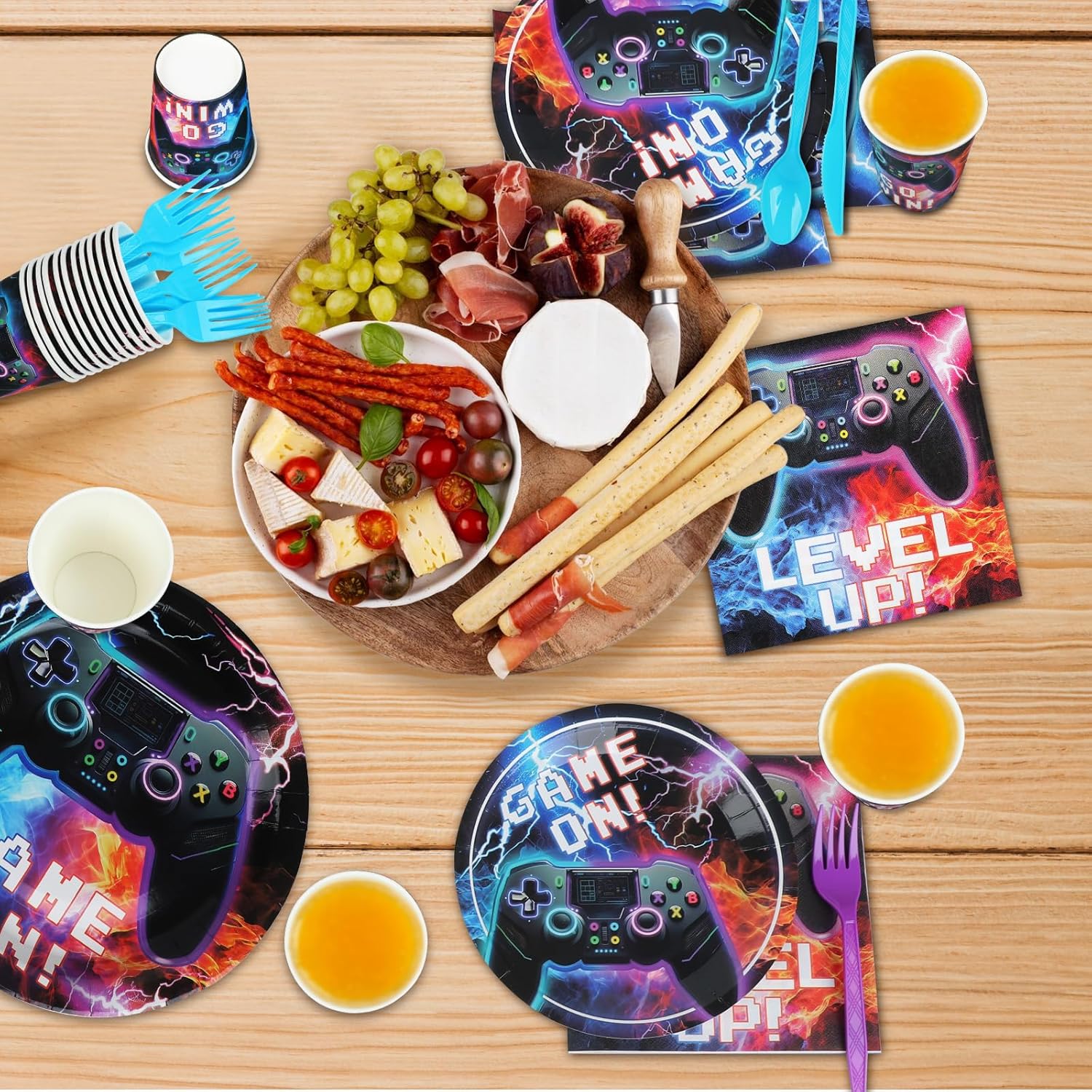 169 PCS Video Game Party Supplies Disposable Paper Plates Napkins Cups Knives Spoons Forks Tablecloth for Kids Gamer Birthday Party Decorations, Serves 24