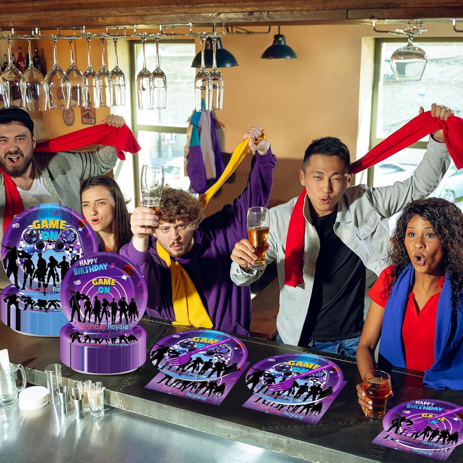 Charming design: Video game plates and napkins feature a captivating “Game On” and “Birthday Royale” design, complete with silhouettes of gamers in action and iconic gaming elements like controllers and parachutes. The vibrant purple and blue color scheme adds a dynamic and exciting atmosphere to your party table.