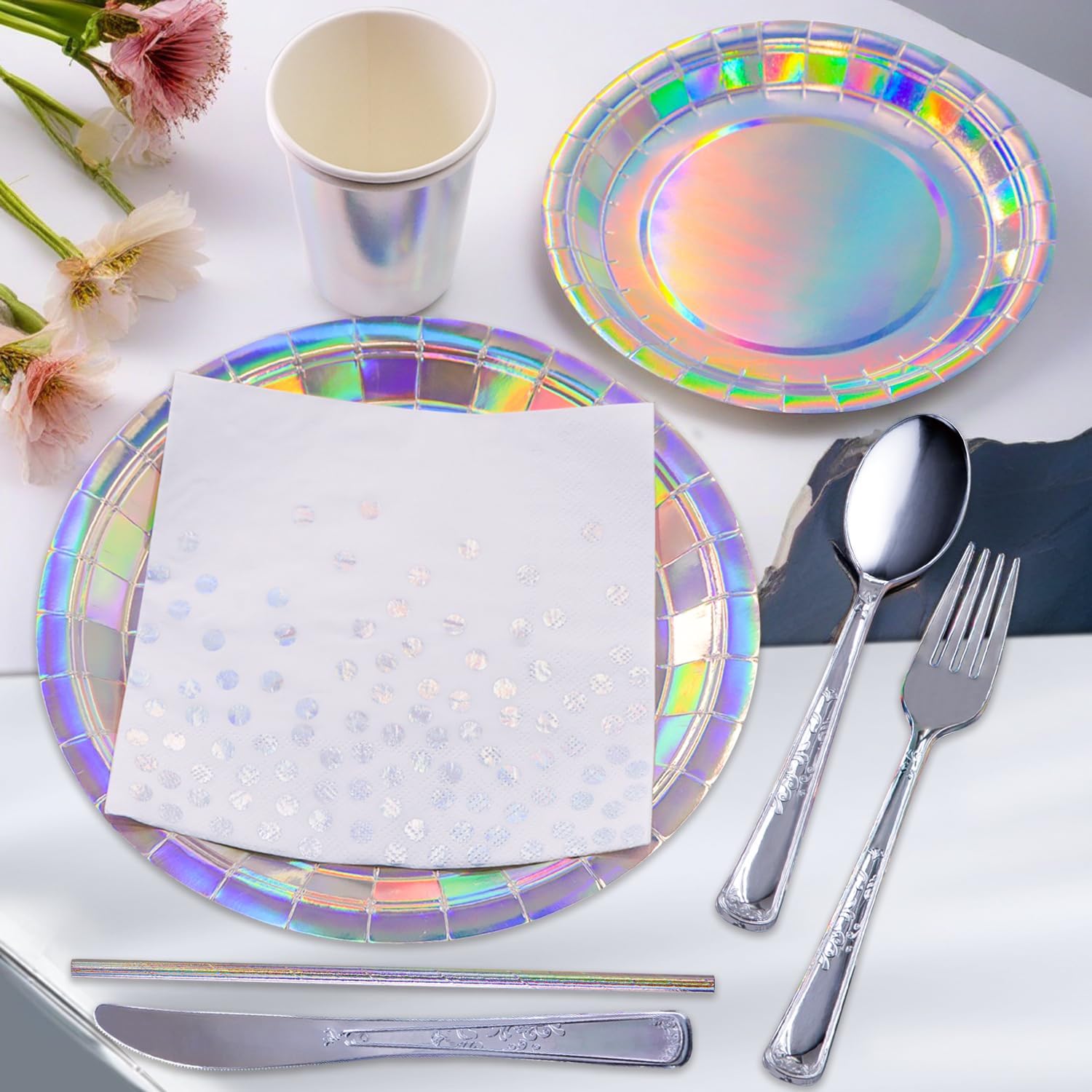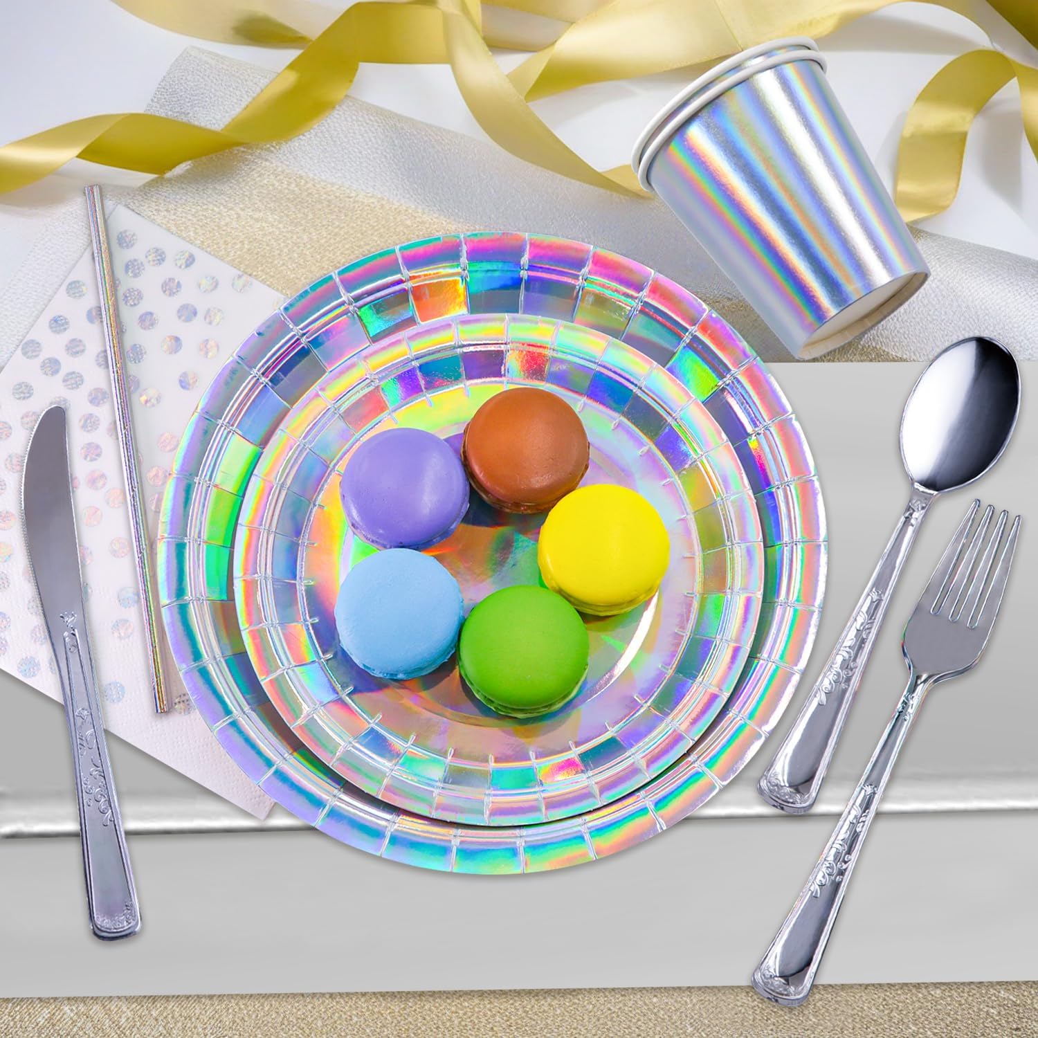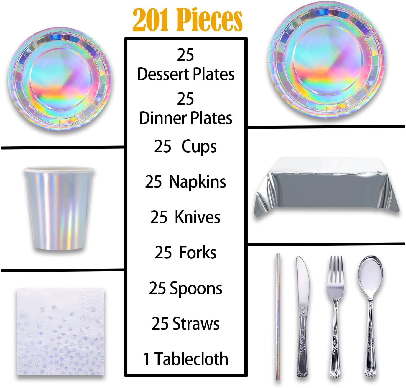 201 Pieces Disposable Party Dinnerware Set -Iridescent Paper Plates Napkins Cups Tubes Silver Plastic Forks Knives Spoons and tablecloth serve for 25 Guests