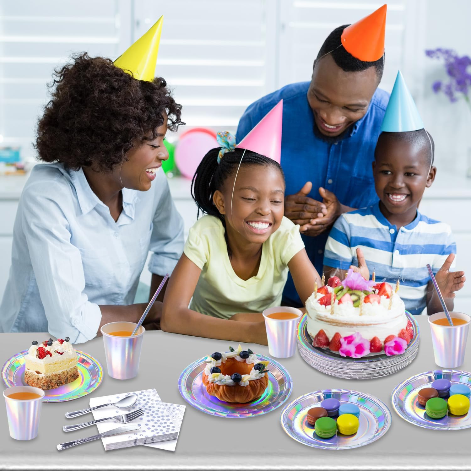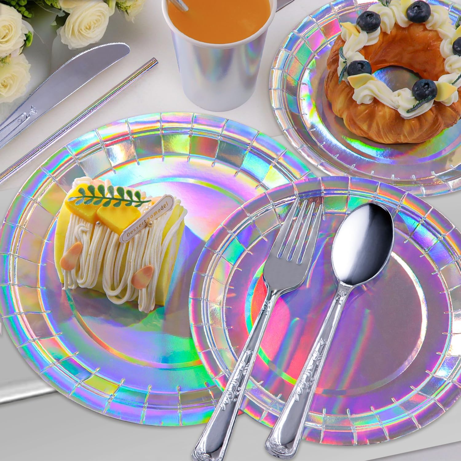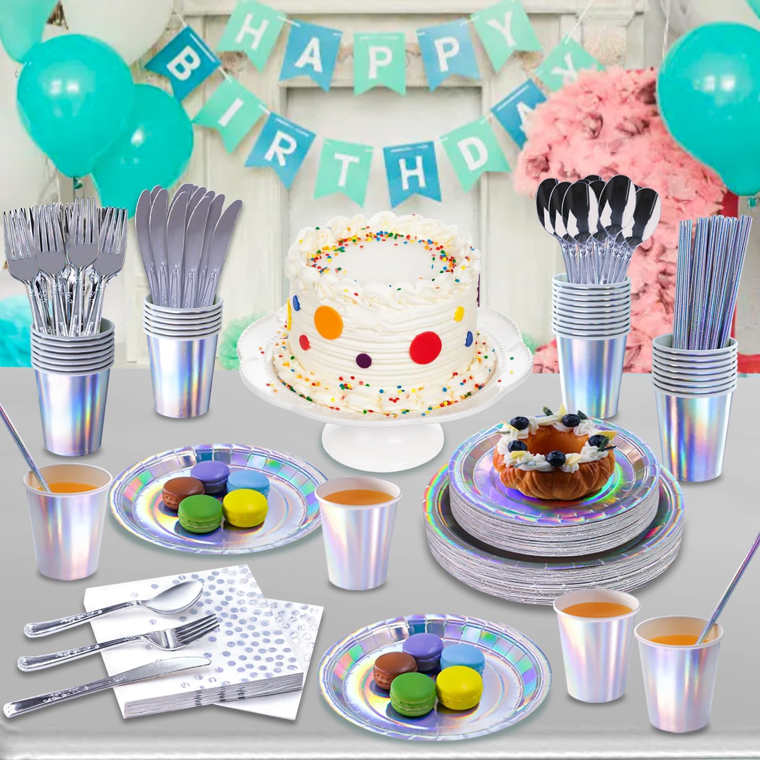 201 Pieces Disposable Party Dinnerware Set -Iridescent Paper Plates Napkins Cups Tubes Silver Plastic Forks Knives Spoons and tablecloth serve for 25 Guests
