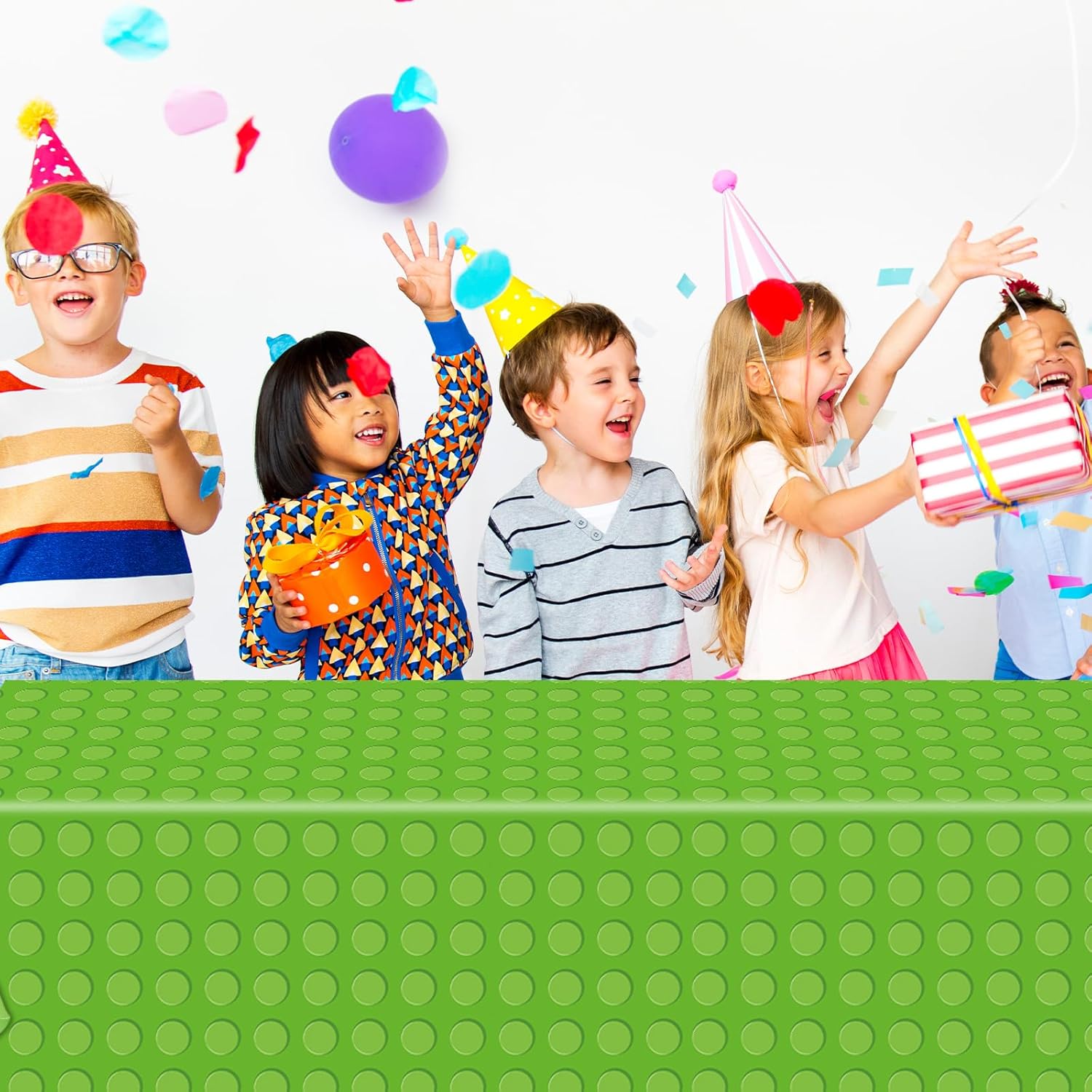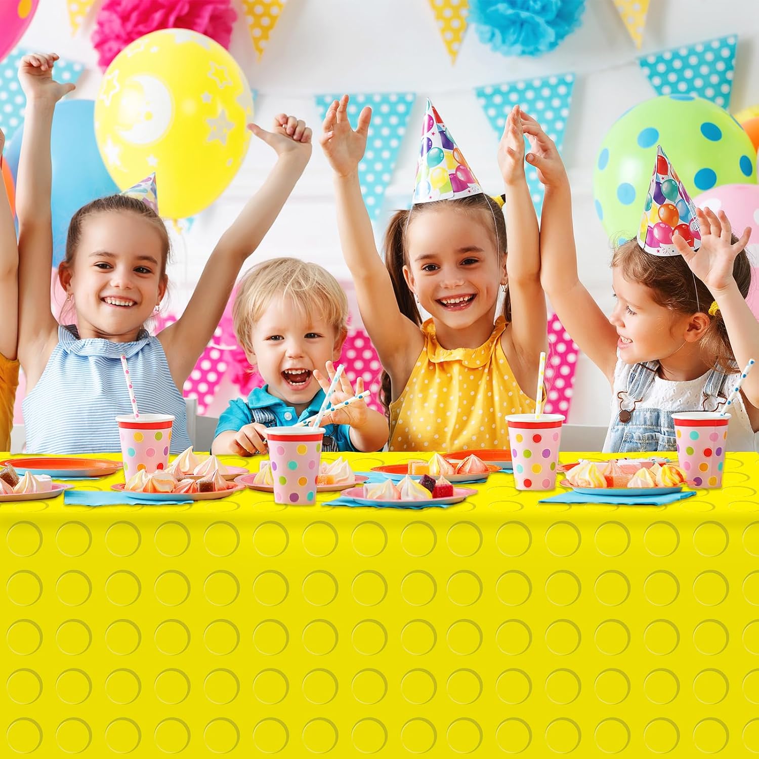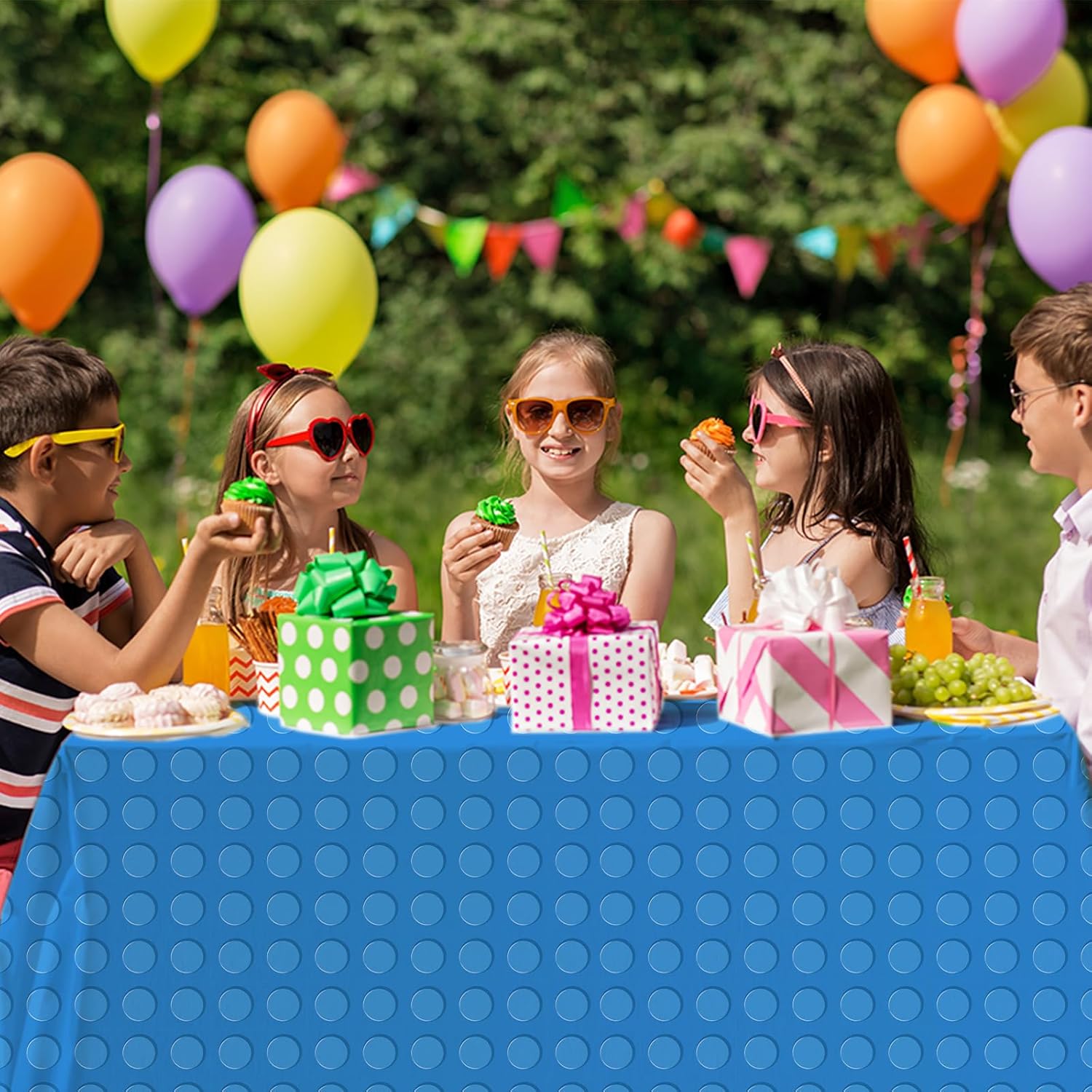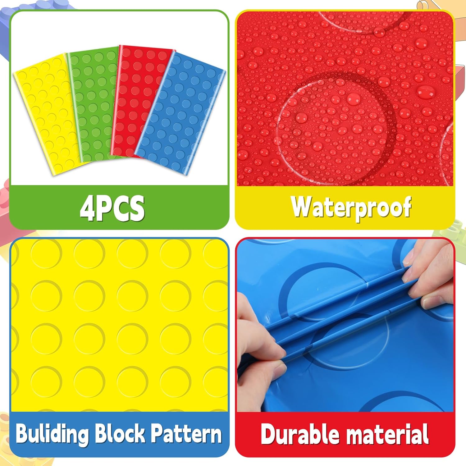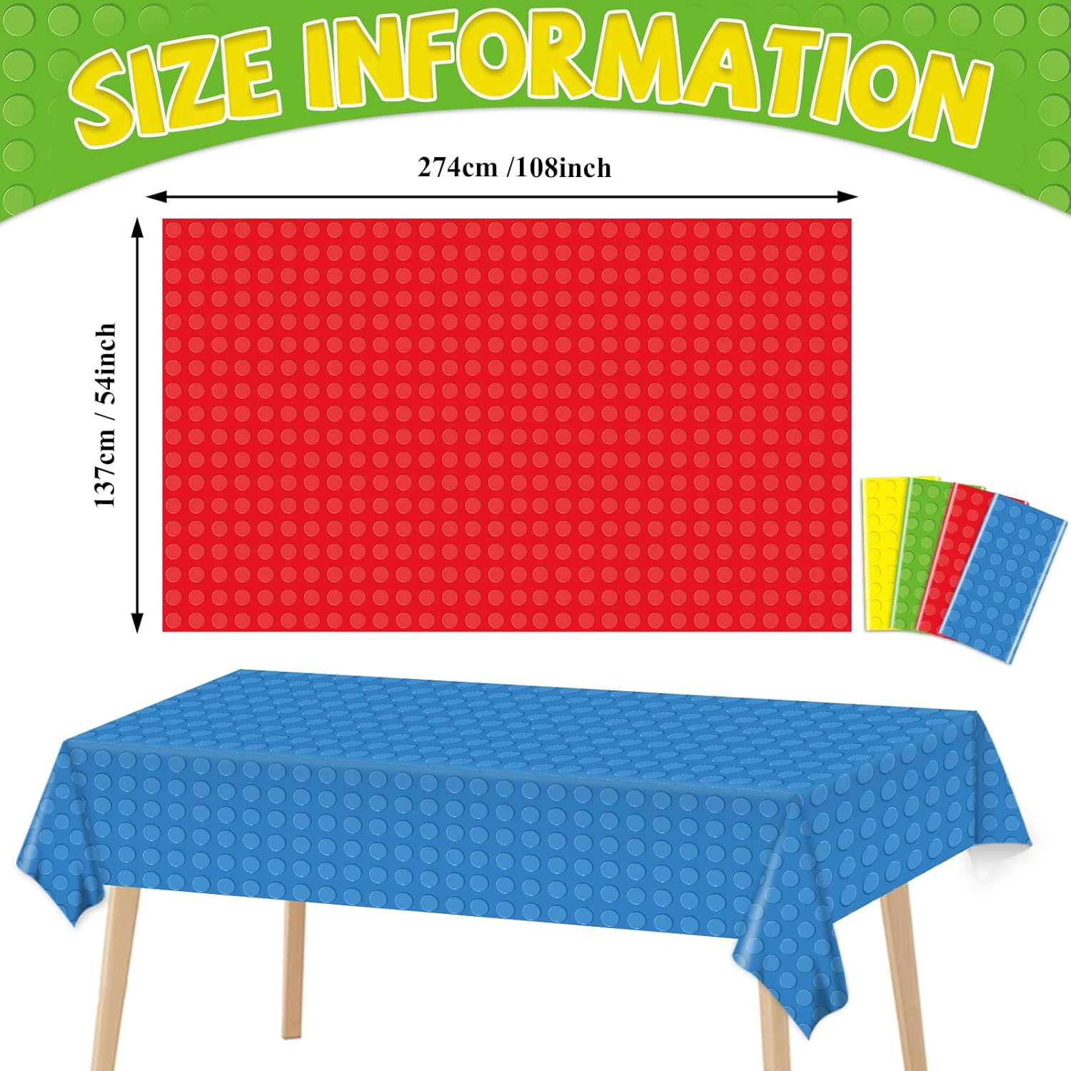 Building Block Party Tablecloths: You will get four different brick tablecloths in rich and bright colors, size: 54*108inches, large size and quantity perfect for most of your party decoration needs.
