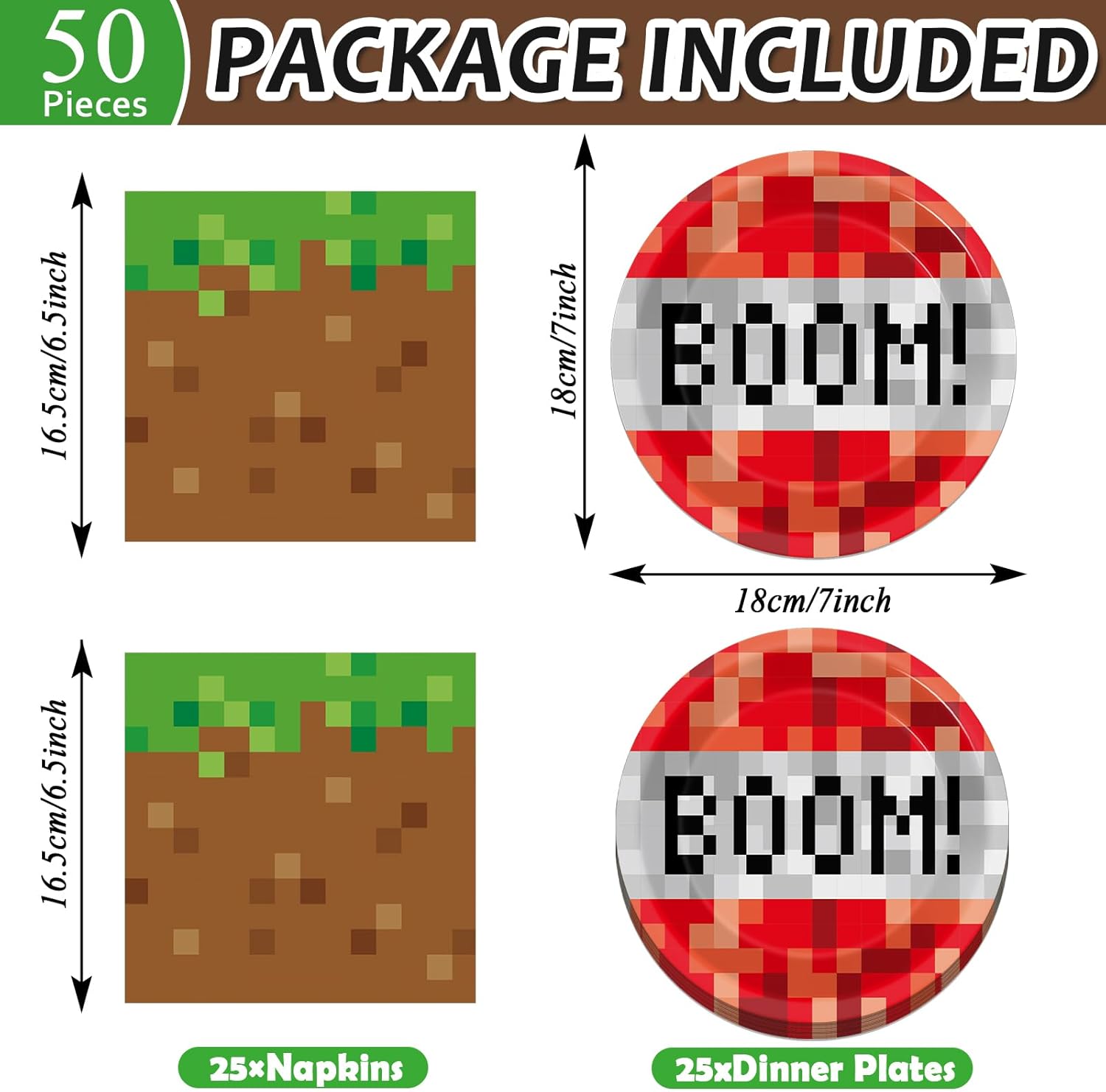 Package includes: The video gamer party supplies come with 25 pieces of pixel birthday party plates of 7inch, 25 pieces mining pixel party napkins of 6.5inch, which can serve for 25 guests. The pixel birthday party tableware are enough to decorate your video game theme party.
