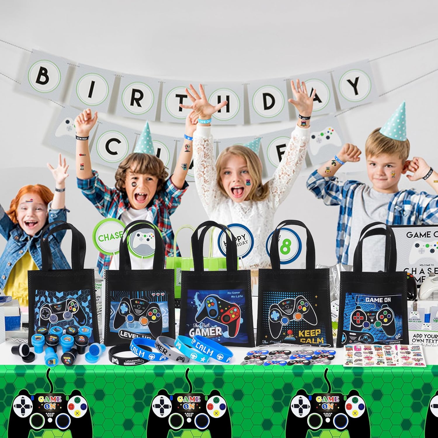 Gaming Birthday Party Favors Gifts: The gamer party bags is made of Non-woven fabric, with 6 different styles of gamepad patterns and color designs, is full of gaming elements. This gift bag comes with a handle, easy to use for kids. Perfect for video game party give away gift