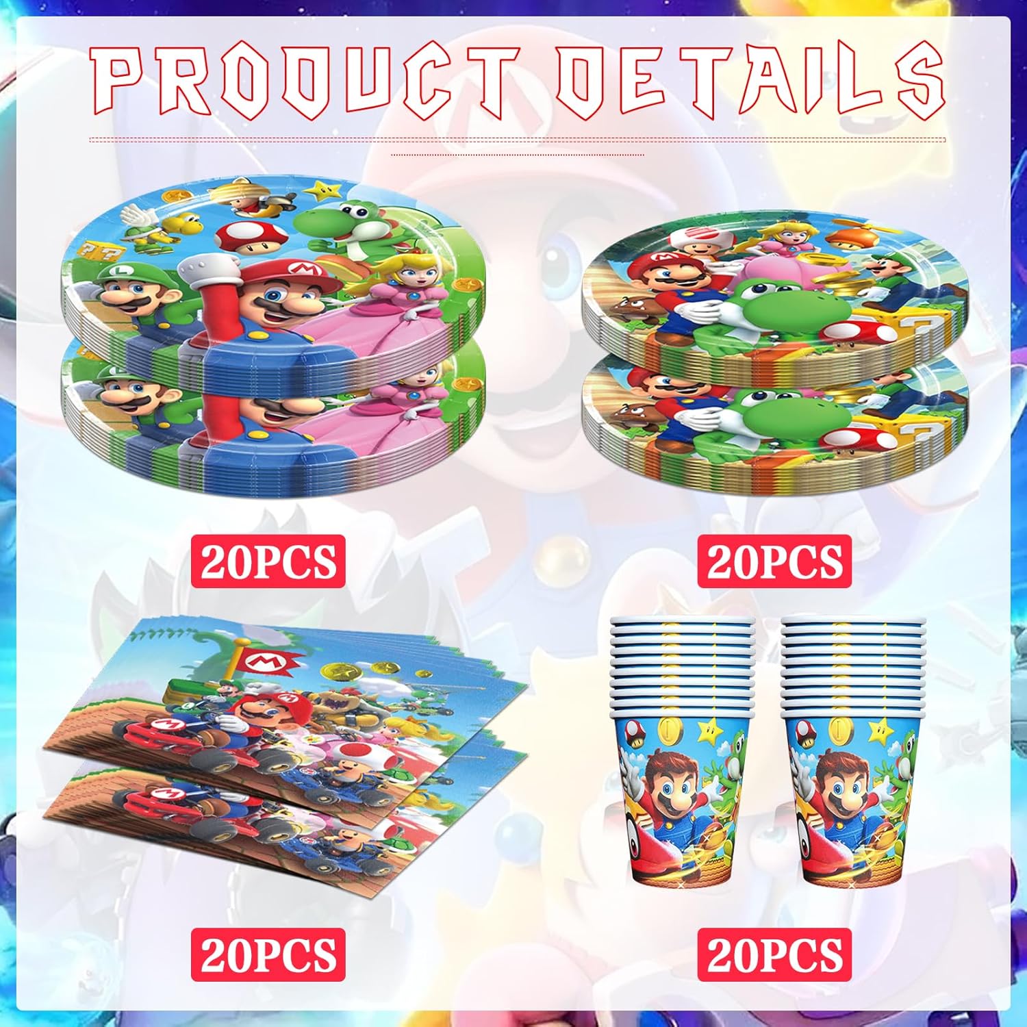 Mario Tableware Set: Mario birthday dinnerware set includes 20pcs 9 inch plates, 20pcs 7 inch plates, 20pcs napkins ( 6.7*6.7inches) and 20pcs paper cups, match for Mario birthday party needs.