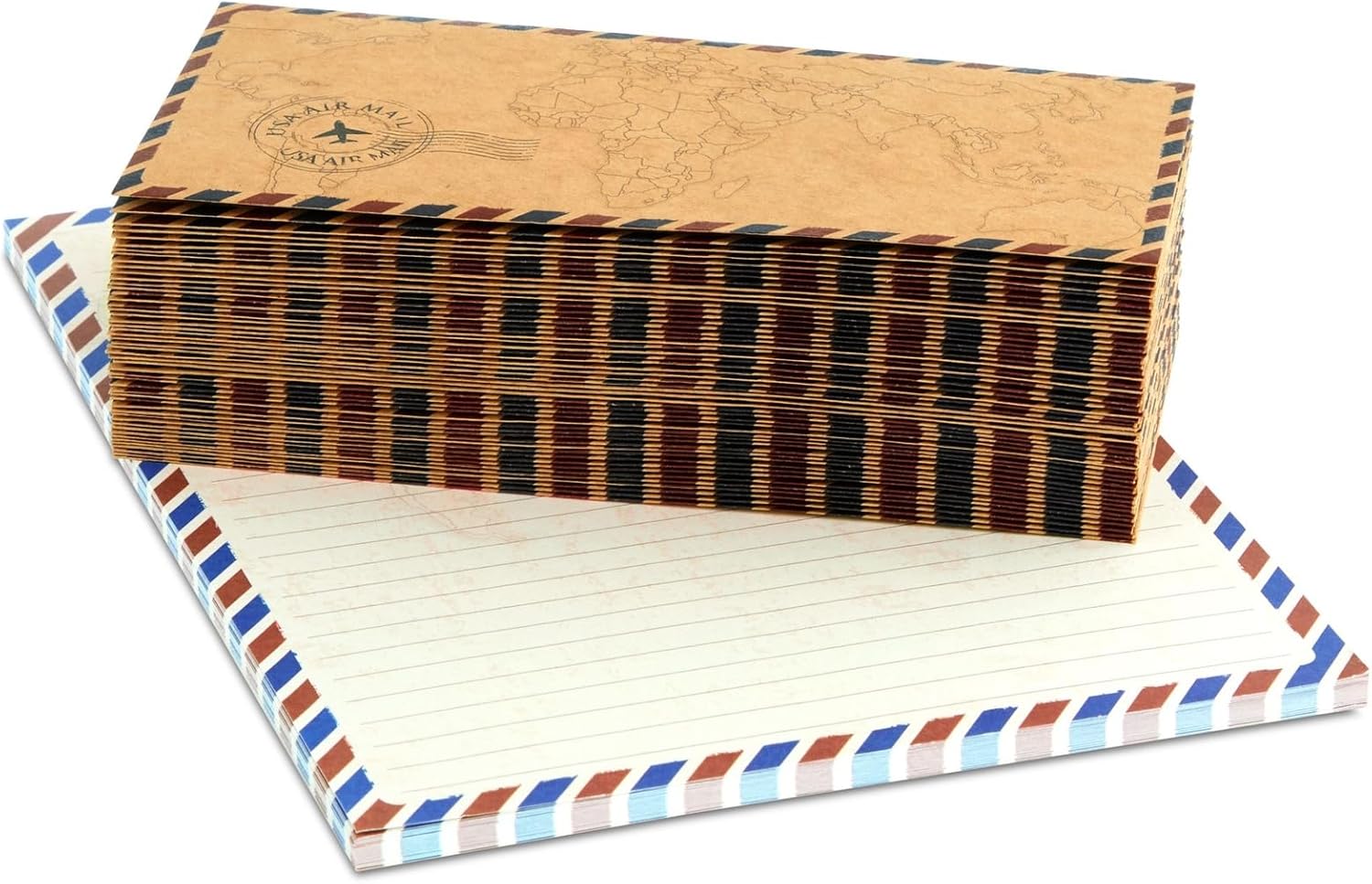 96 Pack Vintage-Style Airmail Stationery Set (48 Lined Paper Sheets with Matching Envelopes) for Letter Writing, Travel Map Design