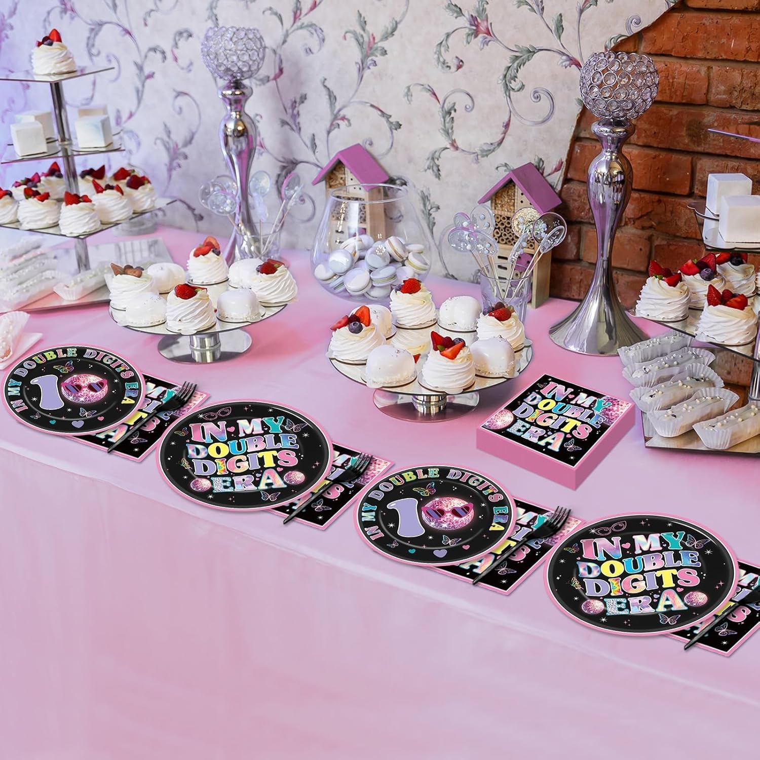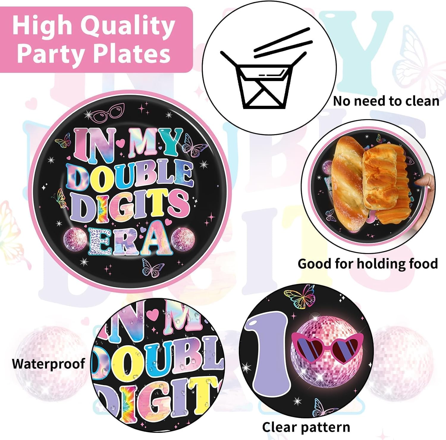 Exquisite design: This 10 birthday party tableware set features a stylish design with a pink and black background adorned with butterflies, disco balls, heart patterns and the phrases ‘In My Double Digits Era’. Elevate your 10th birthday celebration with these cute 10th birthday party supplies, creating a festive atmosphere that will delight all your guests.