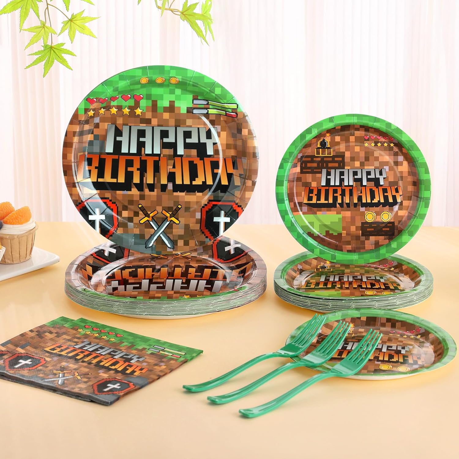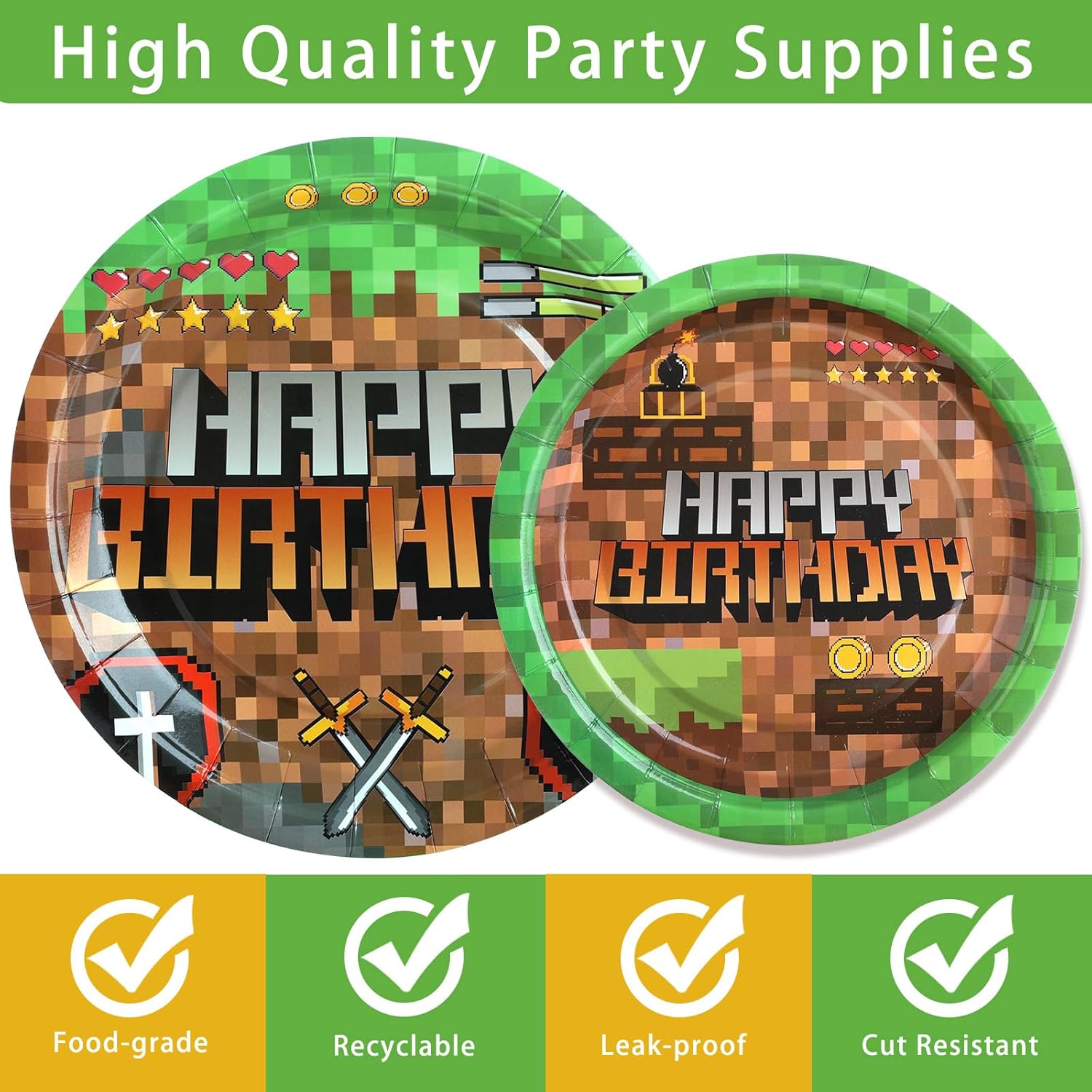 【Unique game theme design】Our Mining Birthday tableware set features a pixel landscape with realistic green grass and brown soil pixel patterns to bring life to your celebration. The pixel plates have Happy Birthday printed in the middle, creating a memorable and visually appealing celebration. It will impress your family and guests