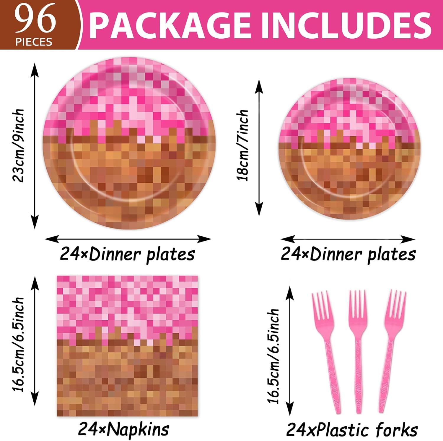 Package includes: The pixel girl party supplies come with 24 pieces of pixel paper dinner plates of 9inch, 24 pieces of gamer paper dessert plates of 7inch, 24 pieces mining pixel party napkins of 6.5inch, 24 pieces of plastic pink forks, which can serve for 24 guests. The pixel girl birthday party tableware are enough to decorate your video game theme party.