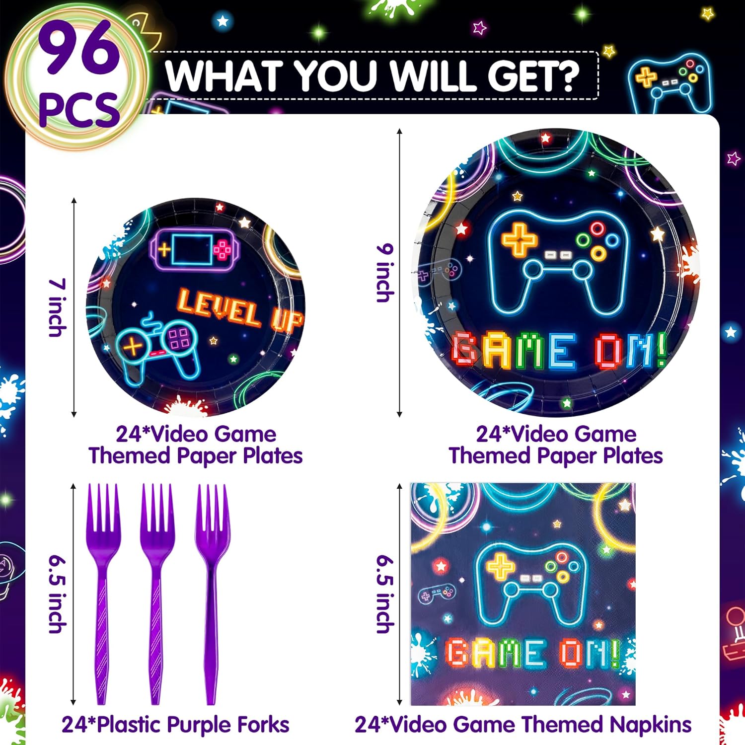 SERVE 24 GUESTS: You will receive 24 9″ video game themed paper plates, 24 7″ video game themed paper plates, 24 video game themed napkins and 24 plastic purple forks, making it easy to serve a group of 24 guests.
