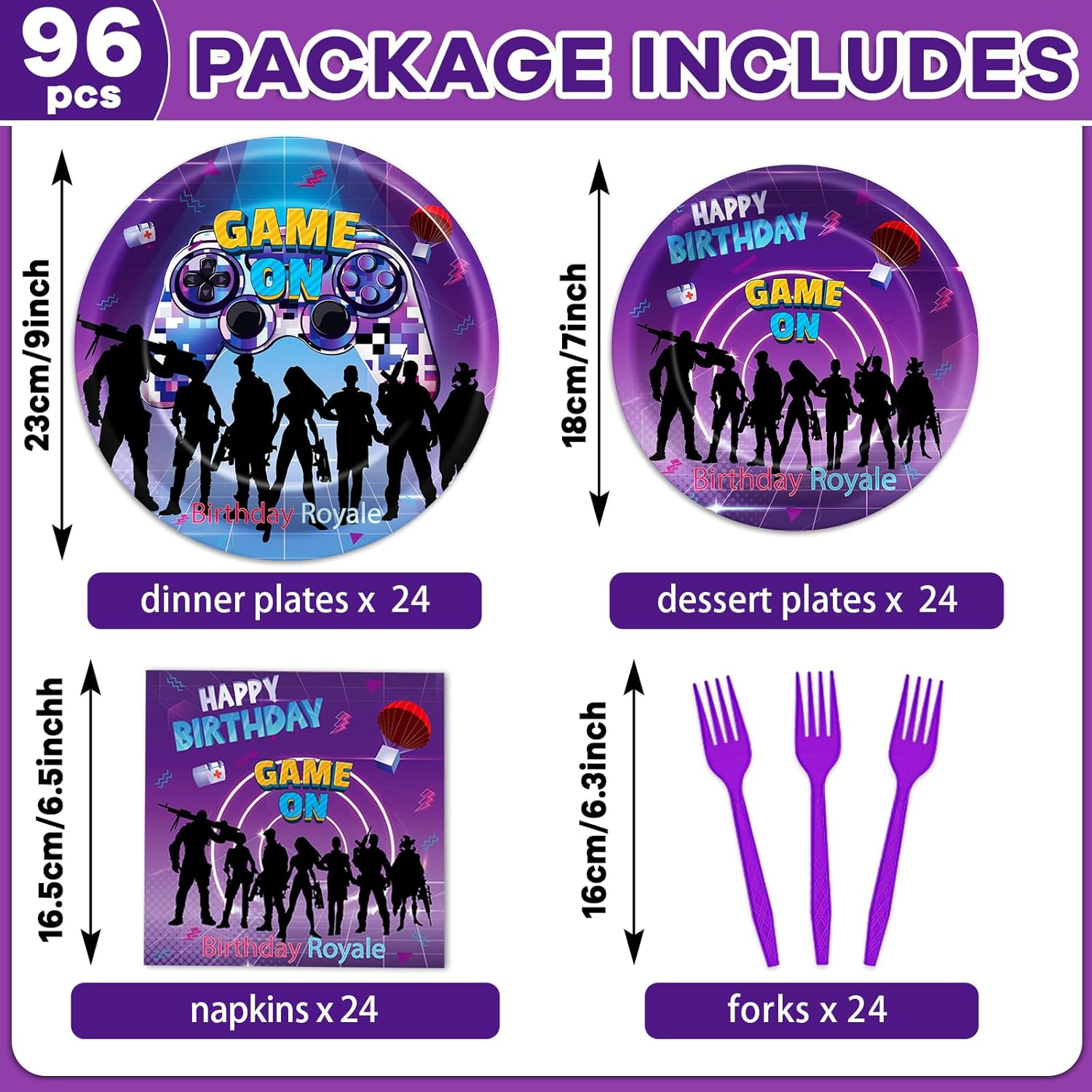 What you will get: The video game party tableware sets includes 24pcs 9” dinner plates, 24pcs 7” dessert plates, 24pcs paper napkins, and 24pcs purple forks that can serve 24 guests, enough quantity to meet your party needs and daily replacements.