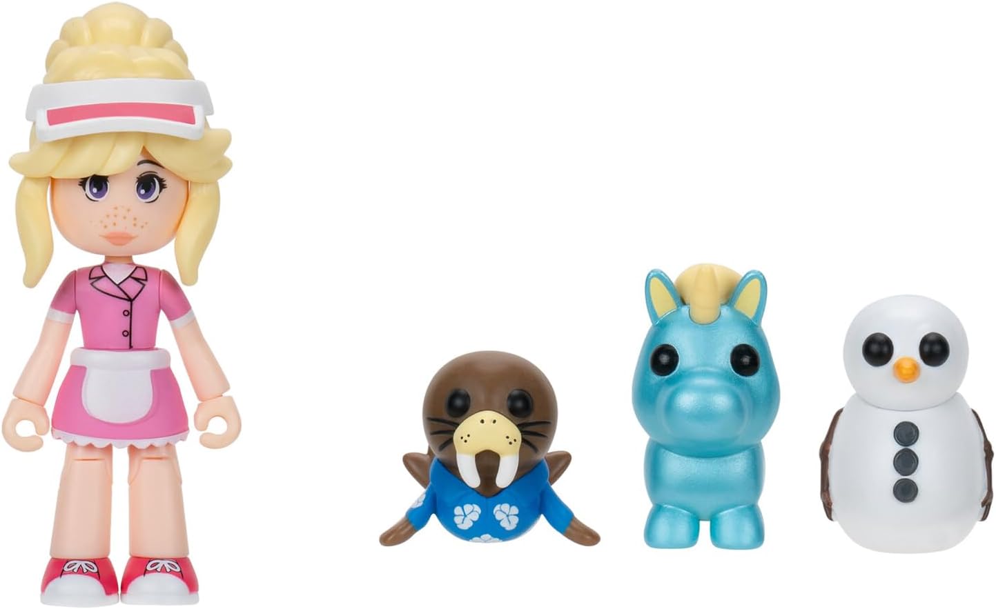 THREE PETS & 1 FIGURE Add the Articulated Figure, Visitor June, and three pets – the Snowman, the Summer Walrus, and the Diamond Unicorn – to your Adopt Me collection