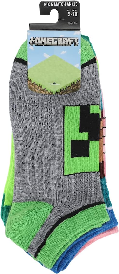 Explore your creative mode in comfort with these Minecraft 5-pair ankle socks. The socks come in shades of gray, pink, blue, green, and black and feature character heads of a creeper, a pig, Black Steve, Alex, and a zombie. The socks are made with a comfortable polyester spandex blend a fit a sock size of 9-11 and a shoe size of 5-10. Minecraft fans will love these comfy ankle socks.