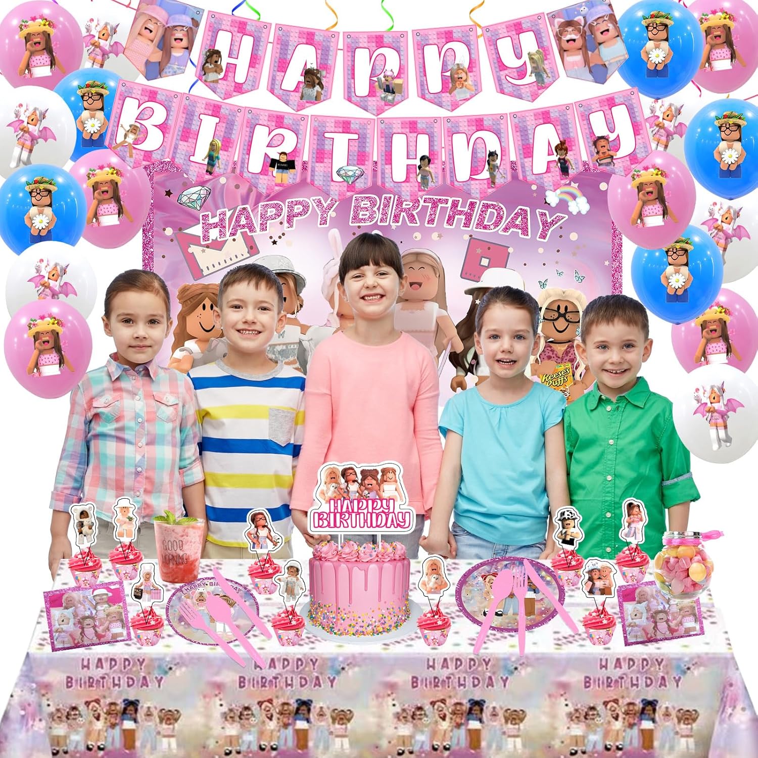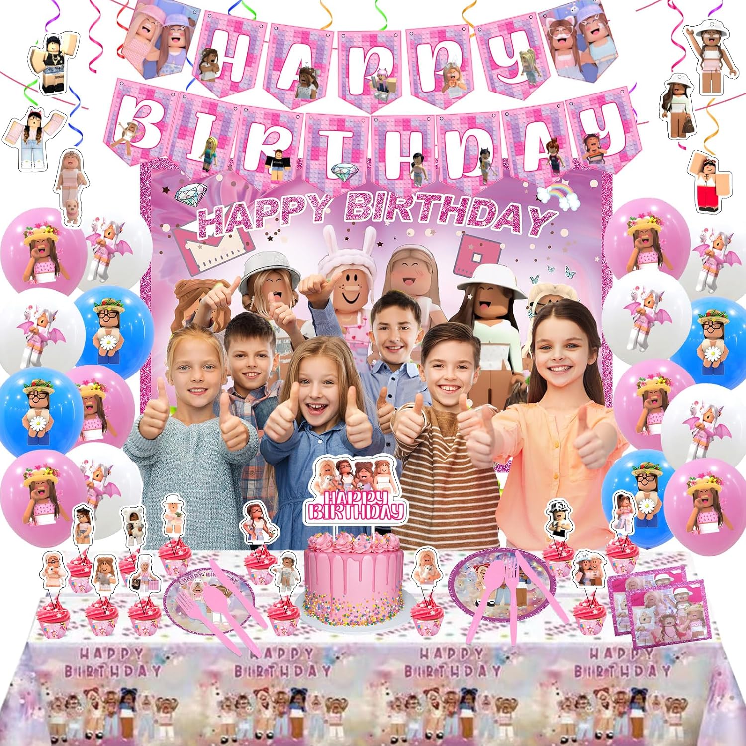 Birthday Party Decorations – Theme Children’s Party Supplies Included Happy Birthday Banner, Backdrop, Hanging Swirls, Tablecloth, Cupcake Cake Toppers, Plates, Tableware, Napkins, Balloons