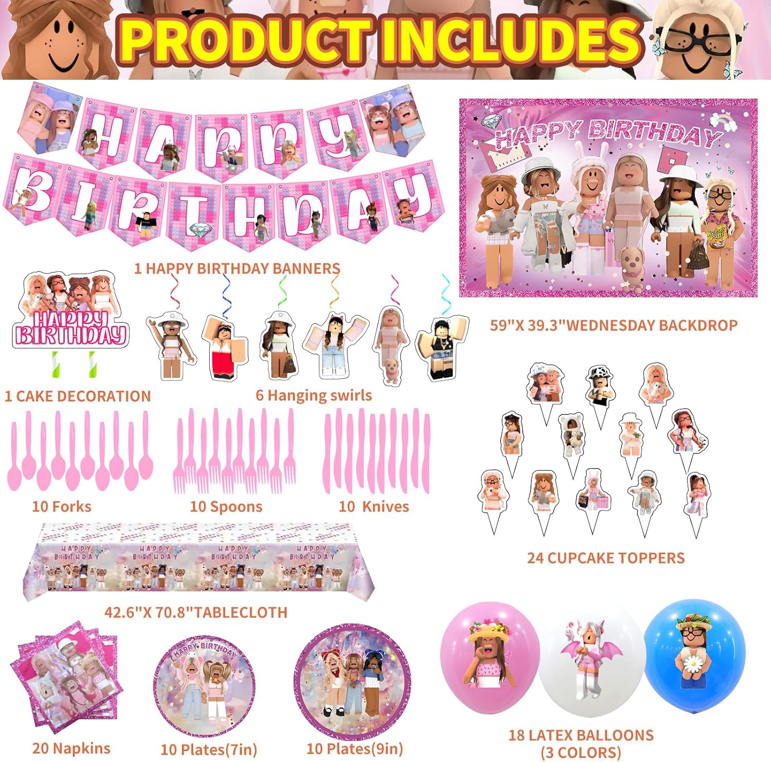 FULL SET OF BIRTHDAY PARTY SUPPLIES: Including 1 happy birthday banner, 1 backdrop, 1 tablecloth, 1 cake decoration, 24 cupcake toppers, 6 hanging swirls, 18 latex balloons, 10-7 inch plates and 10-9 inch plates, 10 knives, 10 forks, 10 spoons, 20 napkins. Meet all your party needs.