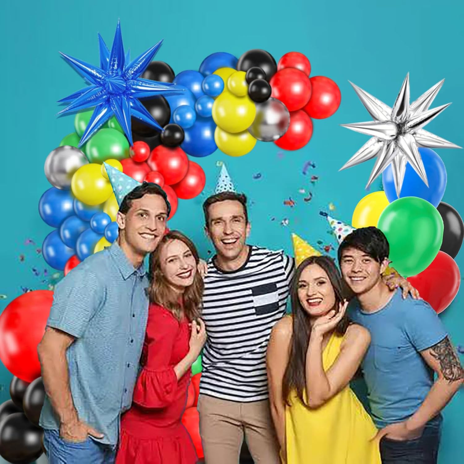 🎈 Package Inclde:Our red blue yellow green black balloon garland arch kit includes red balloons 22pcs(18inch*1,10inch*16,5inch*5), black balloons 16pcs(18inch*1,10inch*10,5inch*5),blue balloons 21pcs(10inch*16,5inch*5),yellow balloons 15pcs(10inch*10,5inch*5),green balloons 15pcs(10inch*10,5inch*5),10inch silver balloons 6pcs,22inch exploding star foil balloons 2pcs,glue dots 3sheets(60points), ribbon 1pc, balloon strip 1pc.