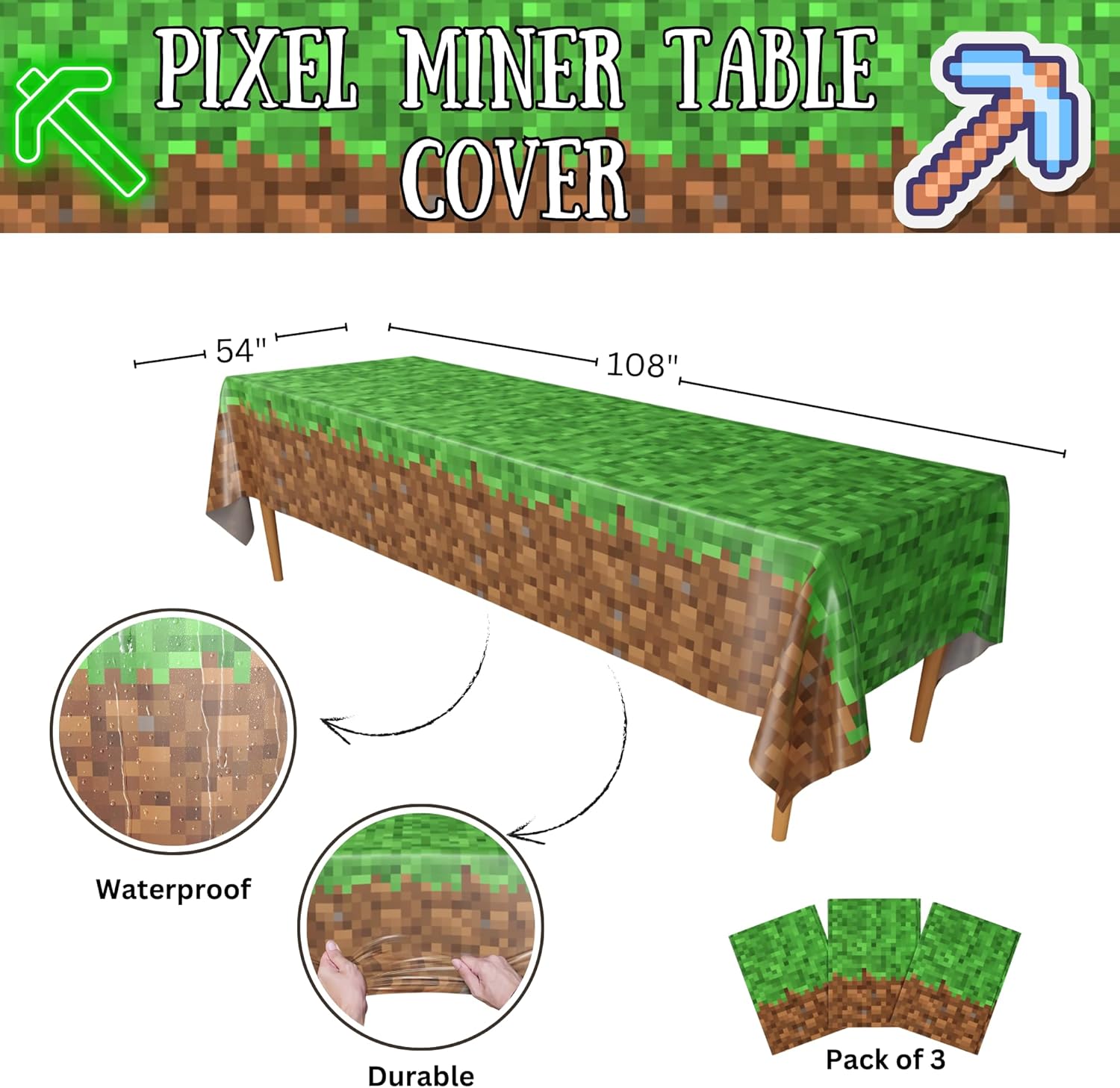 Blue Orchards Pixel Miner Table Cover (Pack of 3) – 54″x108″ XL – Gamer Party Supplies, Mining Craft Party Decorations