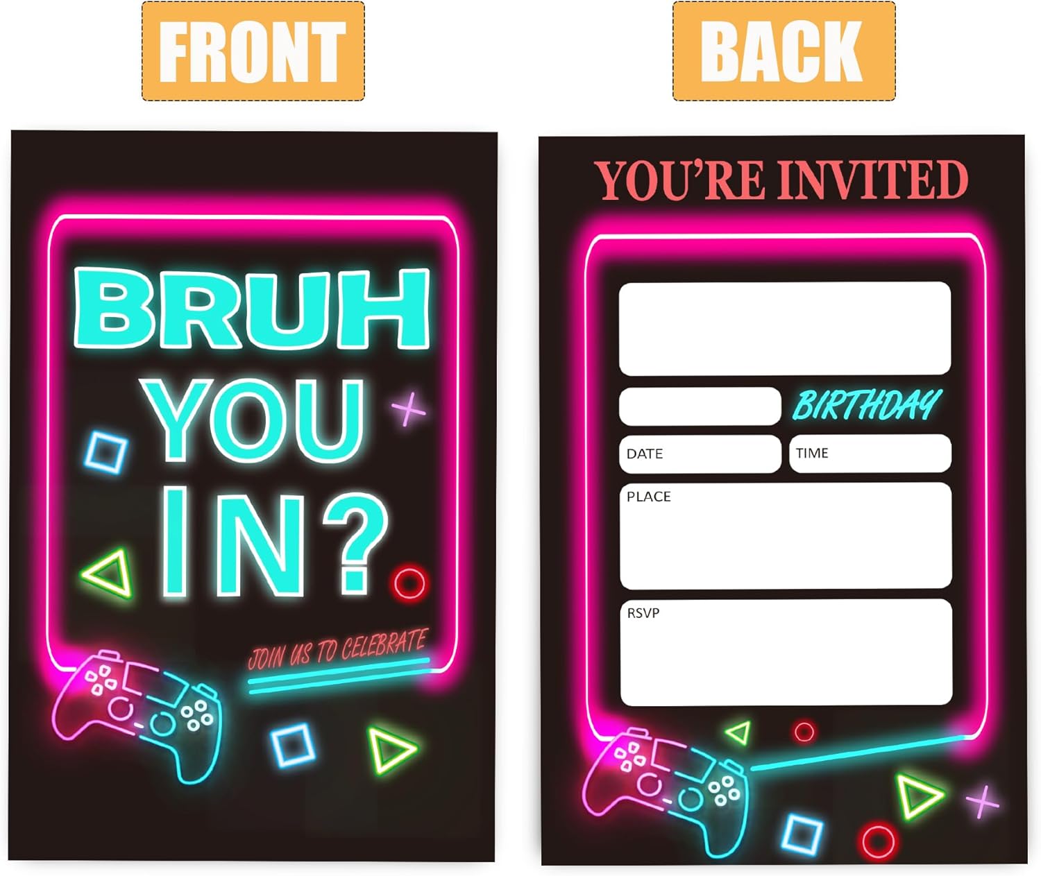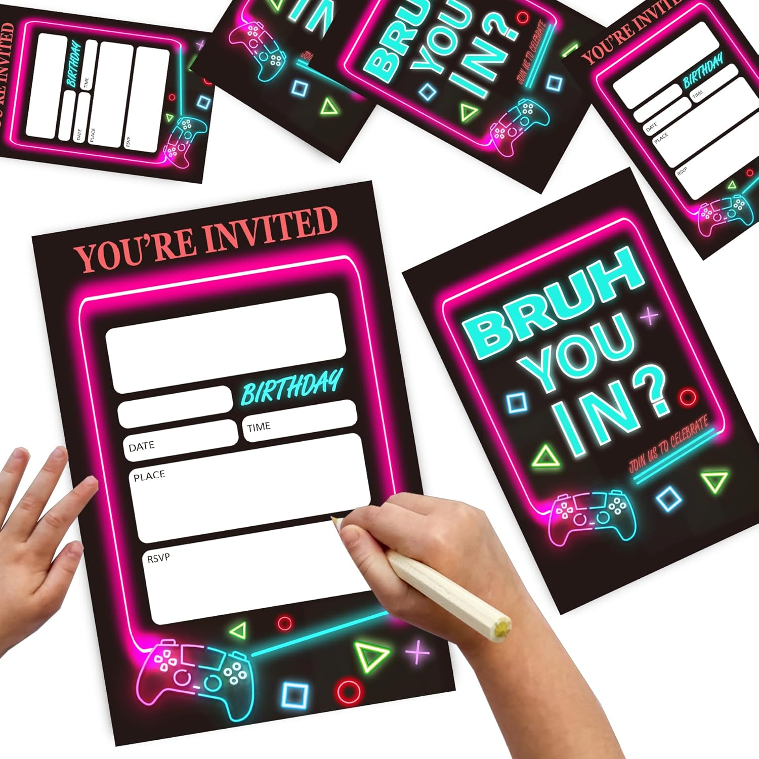 Boy Game Birthday Invitation Card for Boys, Neon Video Game Themed Birthday Party Invites, 30 Cards & 30 Envelopes, 4×6 Inches, Double-Sided