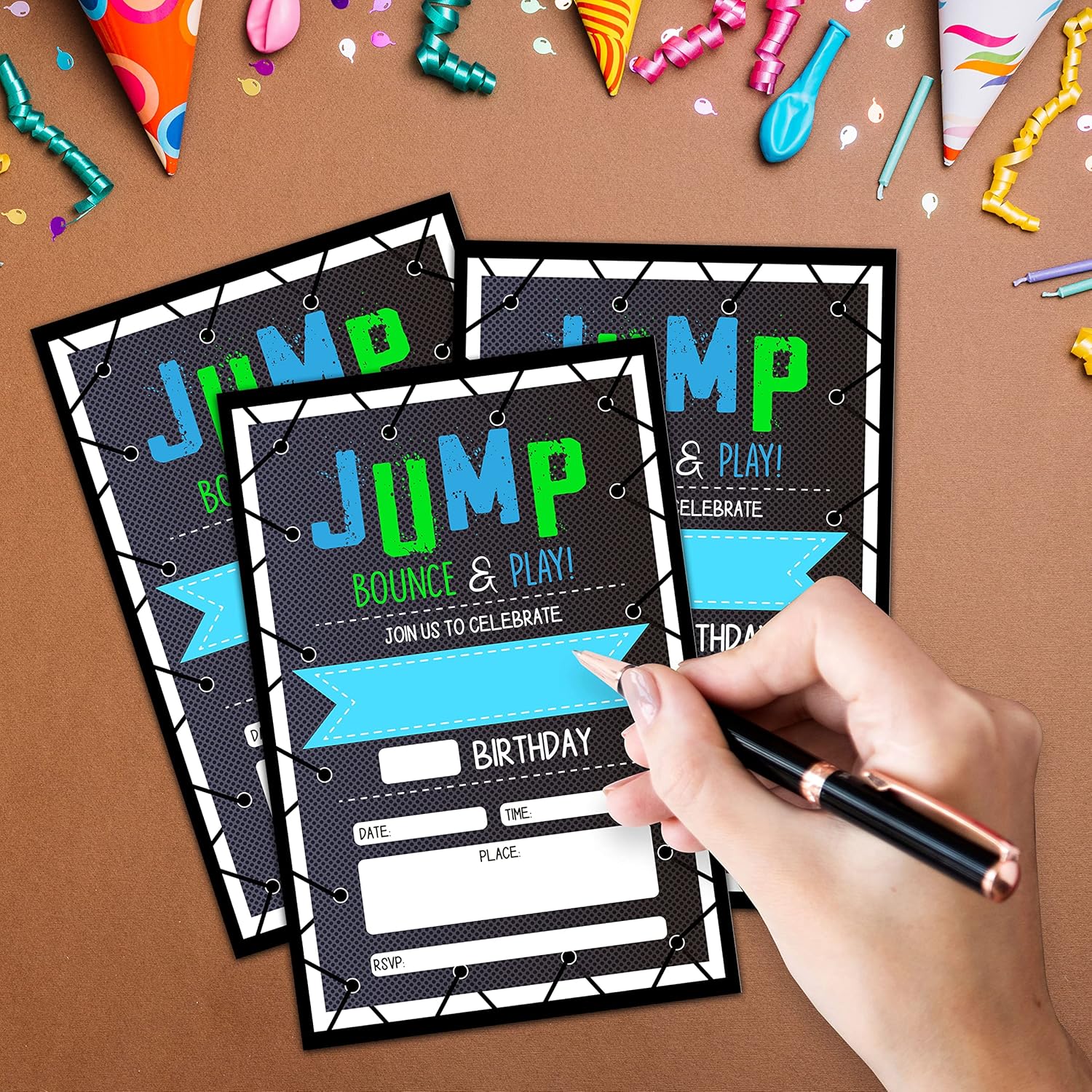 CLIRBE Trampoline Jump Birthday Party Invitations, Bounce House Birthday Invitations For Boys Girls, Kids Birthday Invites, Theme Birthday Party Decorations, 20 Invitations with 20 Envelopes – B02