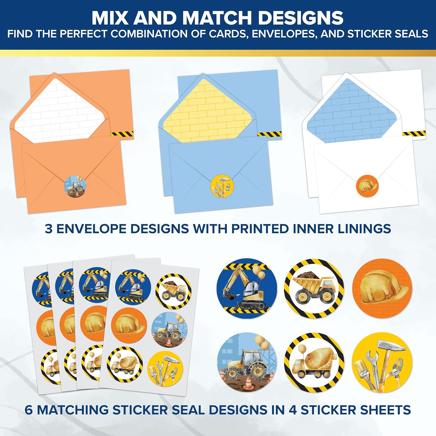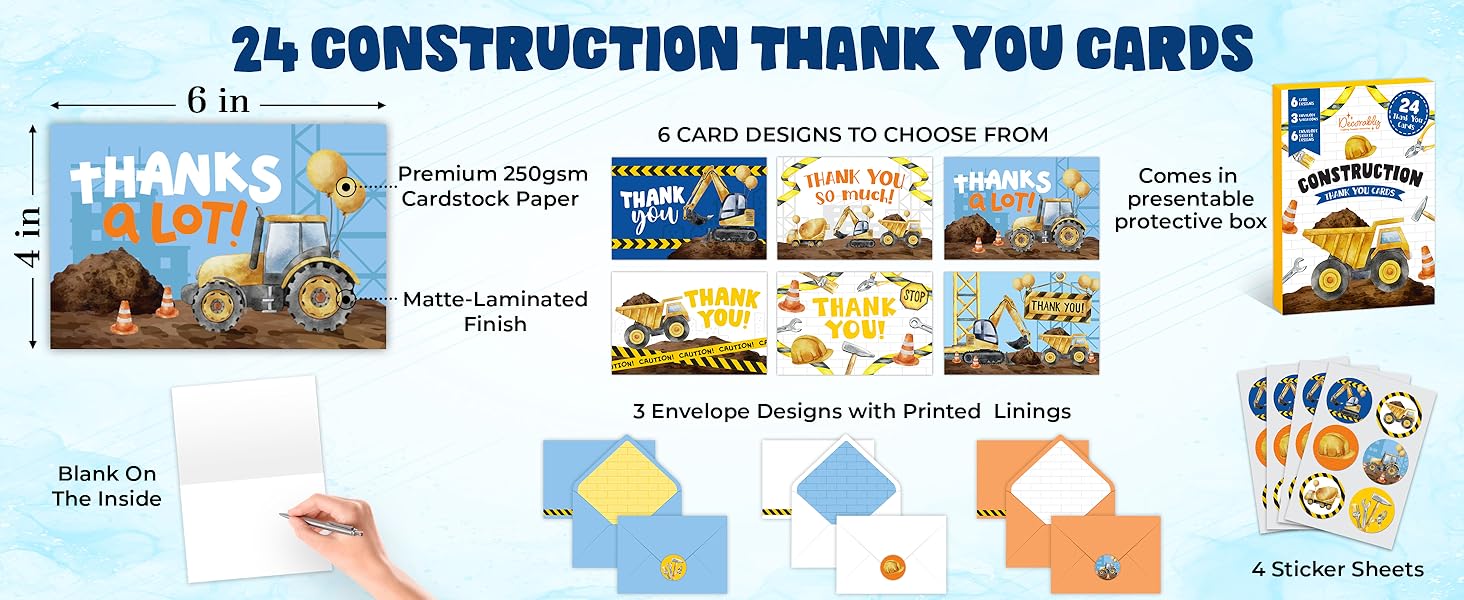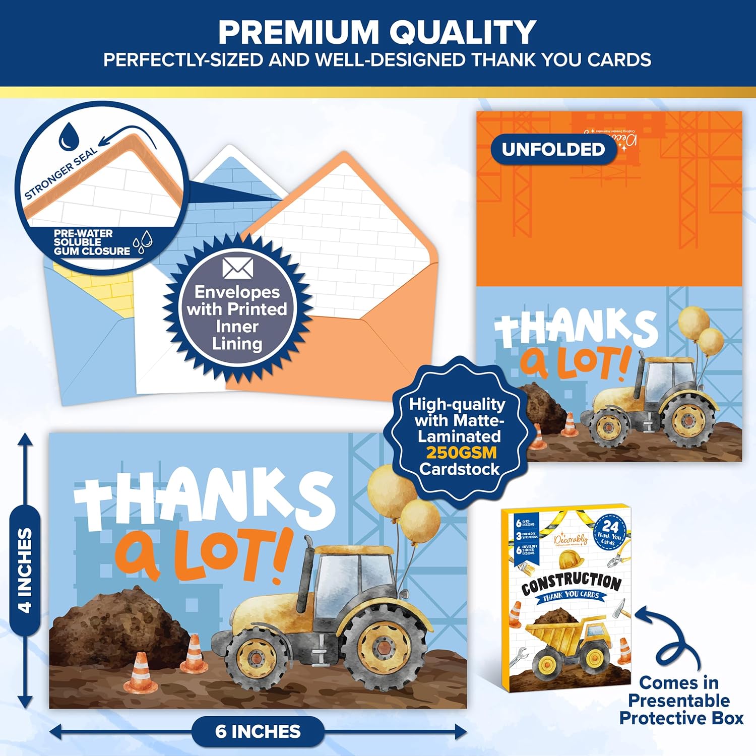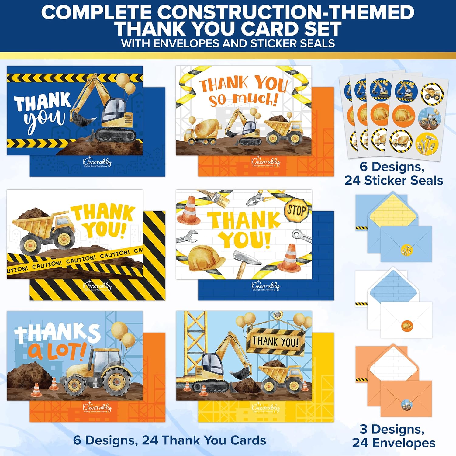 Decorably 24 Pack 6x4in Construction Thank You Cards with Envelopes and Stickers, 6 Fun Designs Kids Thank You Cards, Blank Inside – Kid’s Party, Birthday