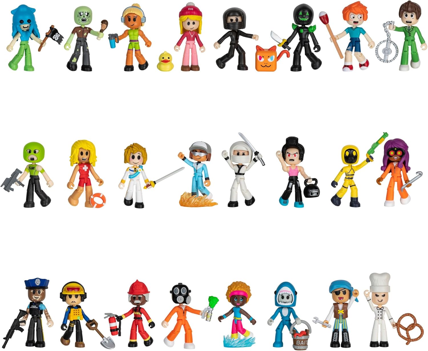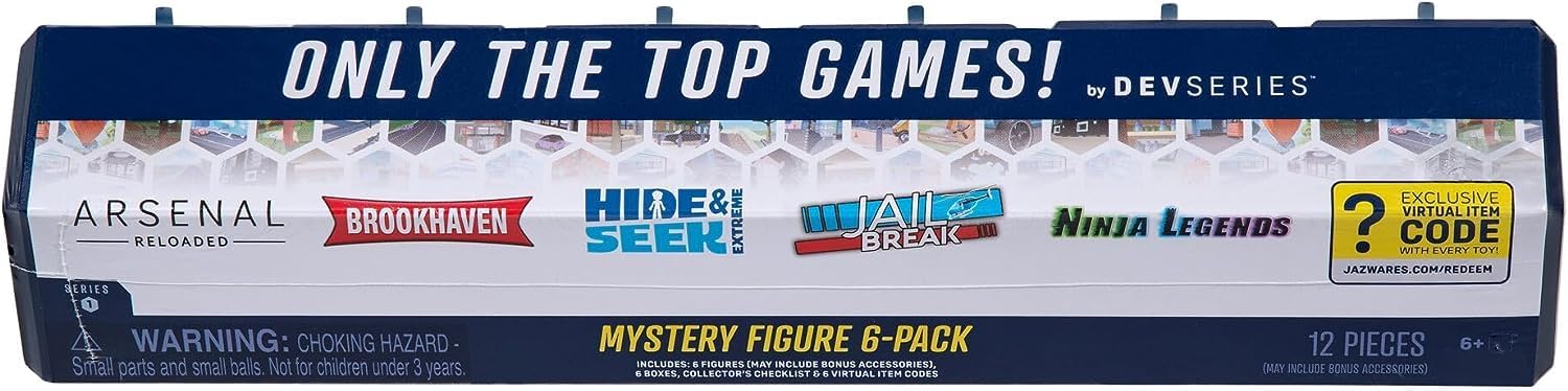 Create the ultimate play experience with DevSeries Mystery Figures. Blinds include one of 24 assorted 2.75-inch action figures and feature popular characters from the following games: Arsenal Reloaded, Build a Boat for Treasure, Brookhaven, Hide and Seek Extreme, Jailbreak, Legends of Speed, Livetopia, Murder Mystery 2, Muscle Legends, Ninja Legends, and SharkBite 2. Each figure has Mix and Match capability so you can put your own spin on each character. Blinds also include an Exclusive Virtual Item Code that unlocks a unique accessory for your avatar. Collect all 24 DevSeries Mystery Figures and showcase your love for game devs. Officially licensed product from Jazwares. Ages 8+