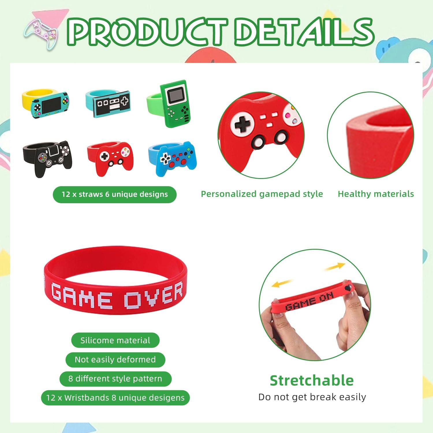 Interactive Accessories – Comes with 12 video game-themed silicone wristbands, rings, and keychains for added fun and souvenir value