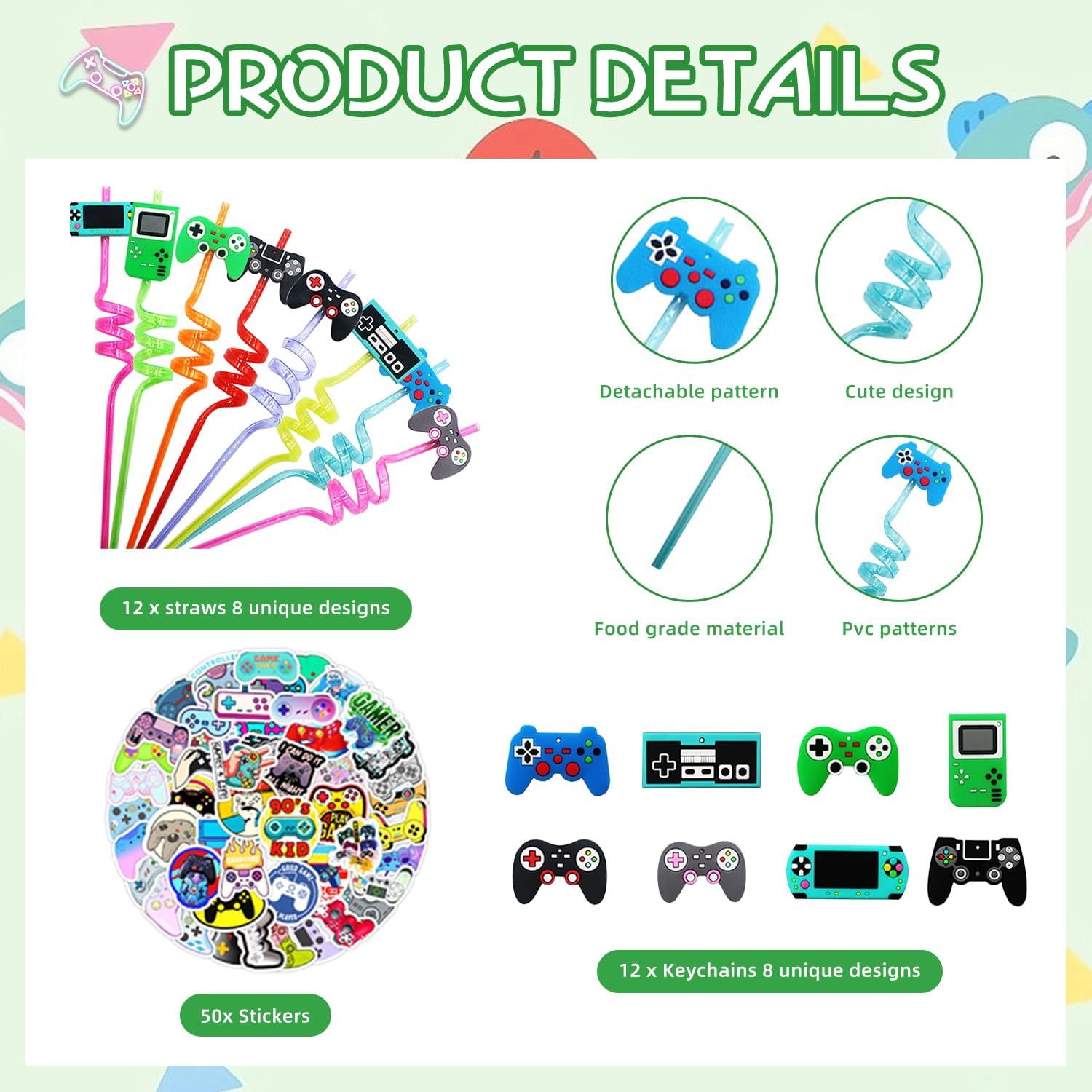 Practical Party Decorations – 12 themed straws for cool refreshments and 50 stickers to decorate your gaming birthday party space