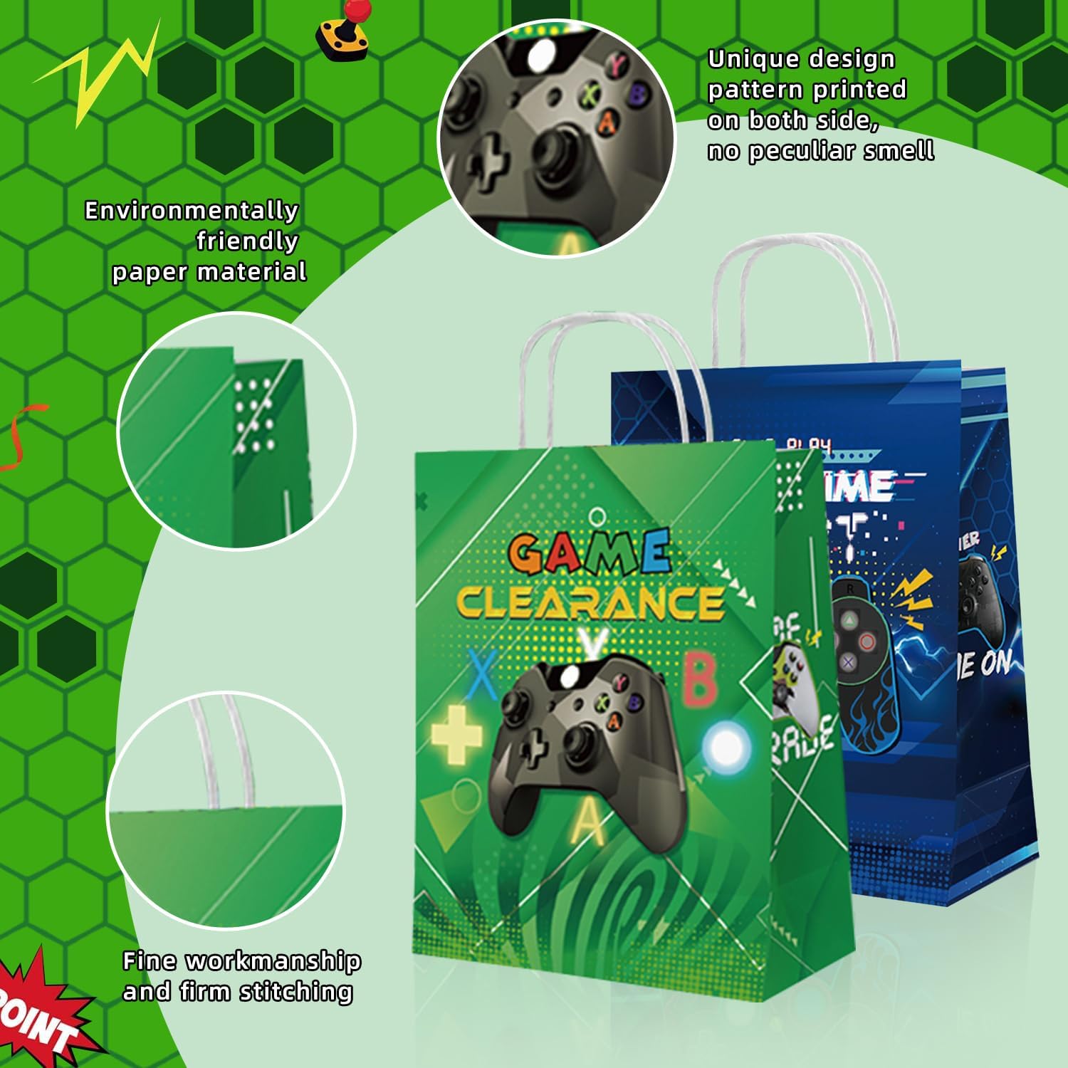 Exclusive Gaming Design – 12 unique gamer-inspired handy paper bags (blue & green) to hold treasures from your gaming party