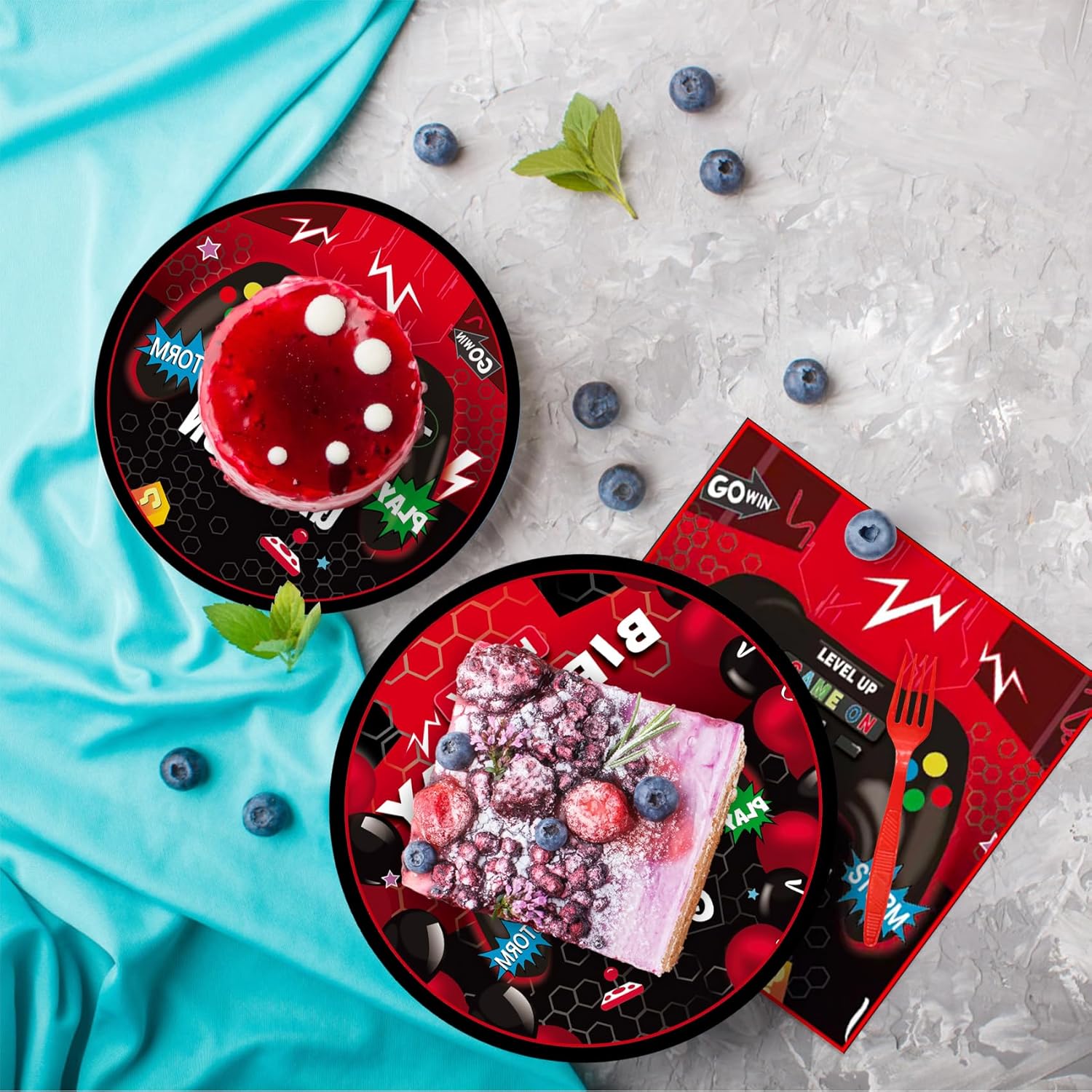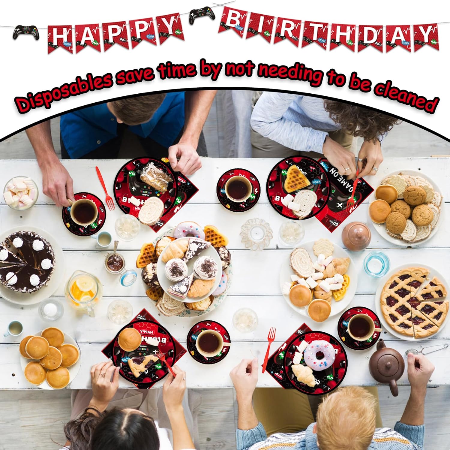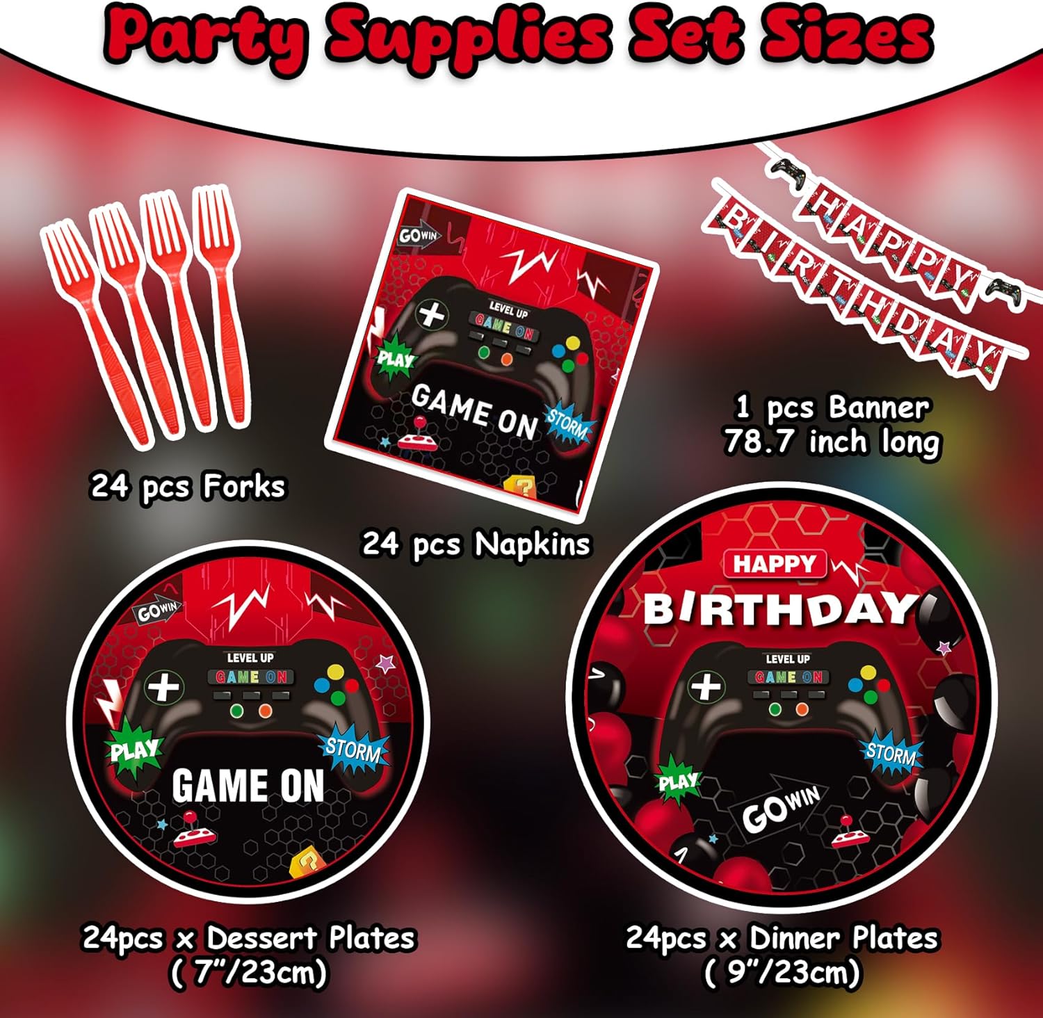 Gamer Theme Party Kit for 24 Guests – 97 Pcs Including Plates, Forks, Napkins, Bunting – Level Up Your Birthday Bash with Epic Gaming Decor
