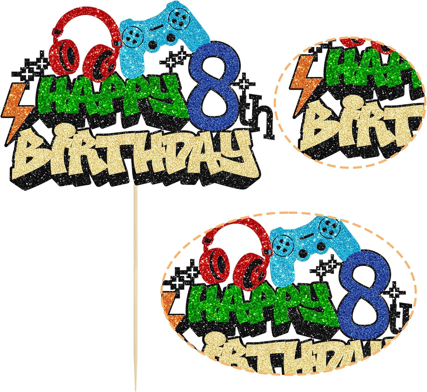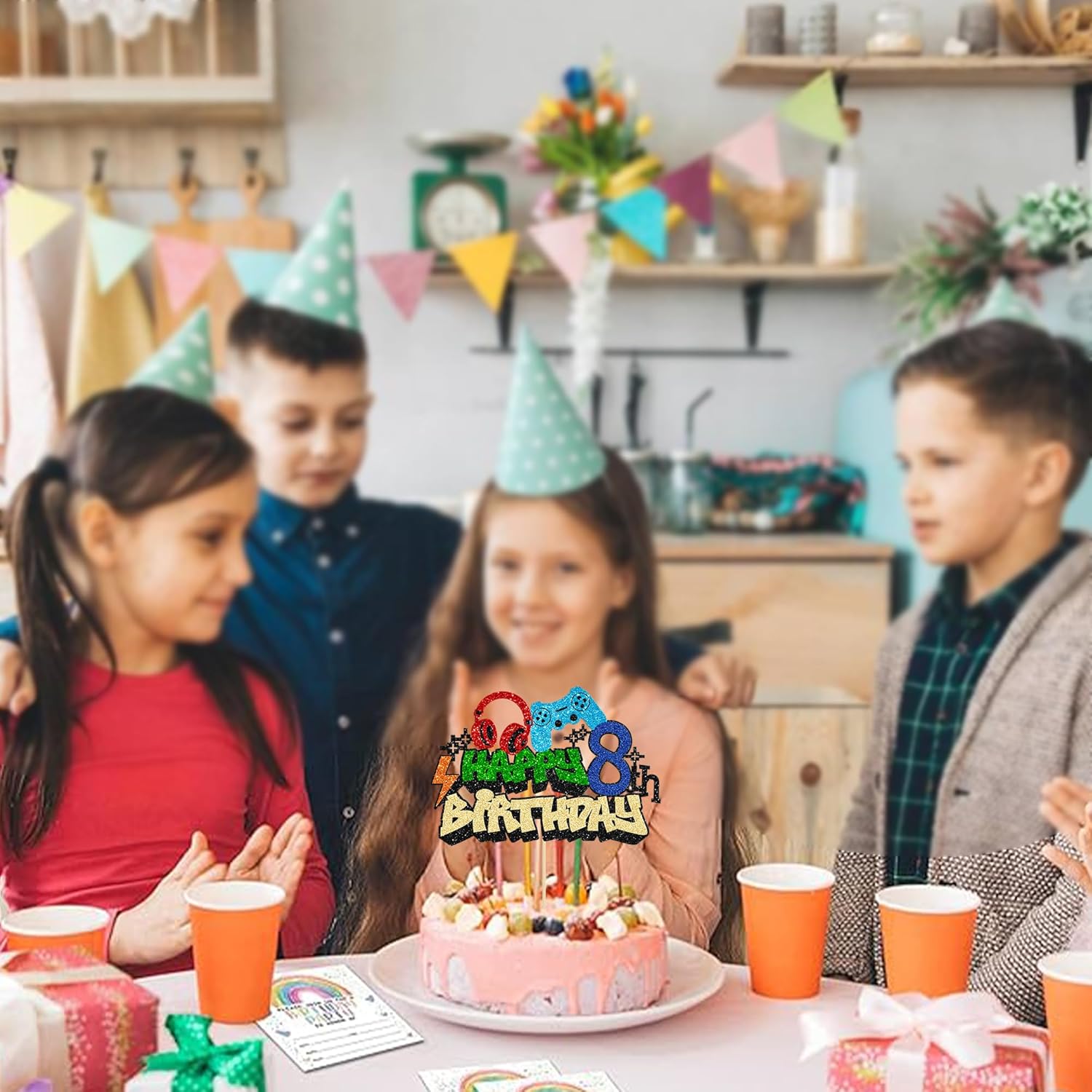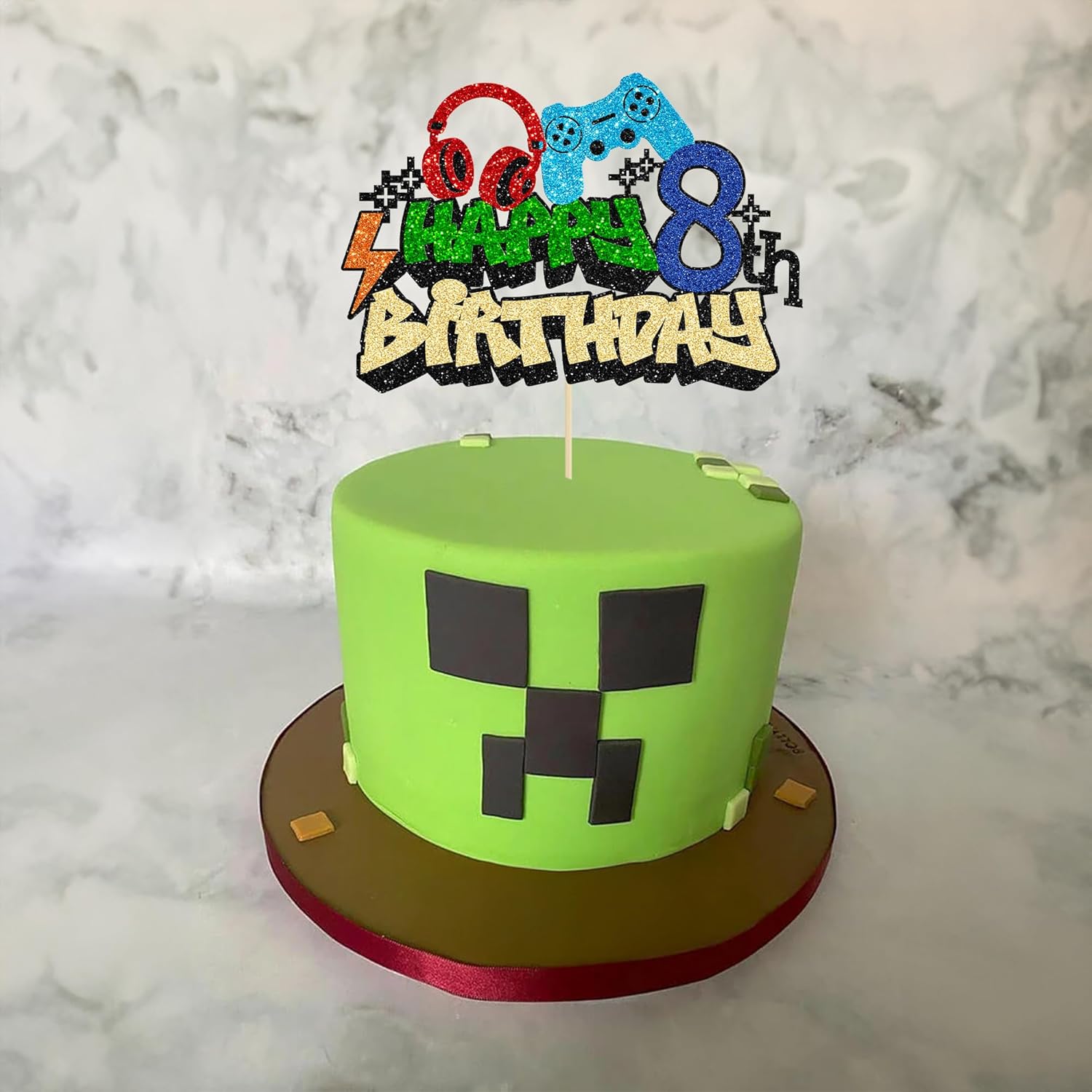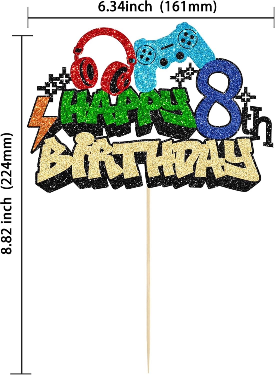 Gyufise 1Pcs Video Game Happy 8th Birthday Cake Topper Glitter Video Game Cake Pick Game On Controllers Tenth Cheers to 8 Years Cake Decoration for Boys 8th Birthday Party Supplies