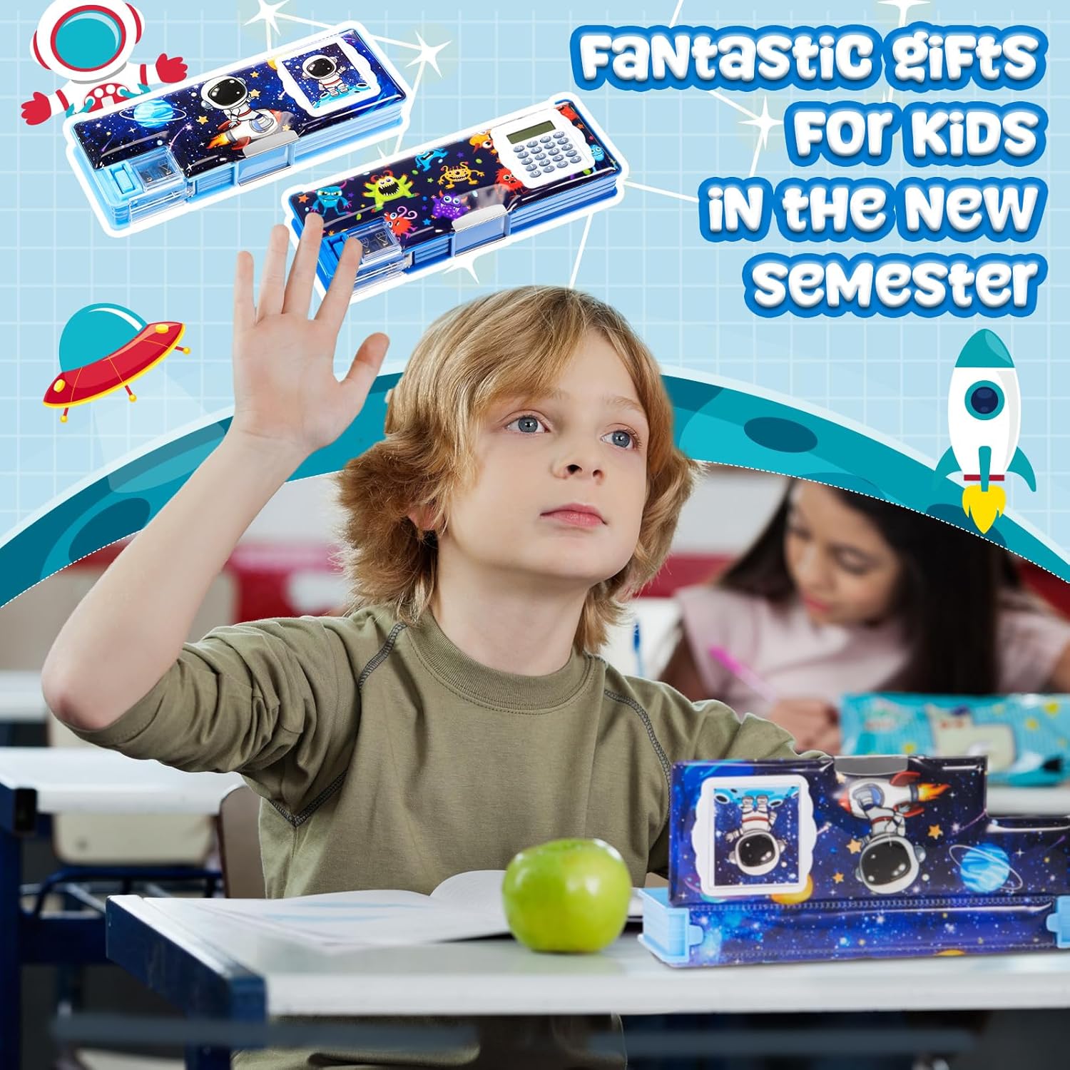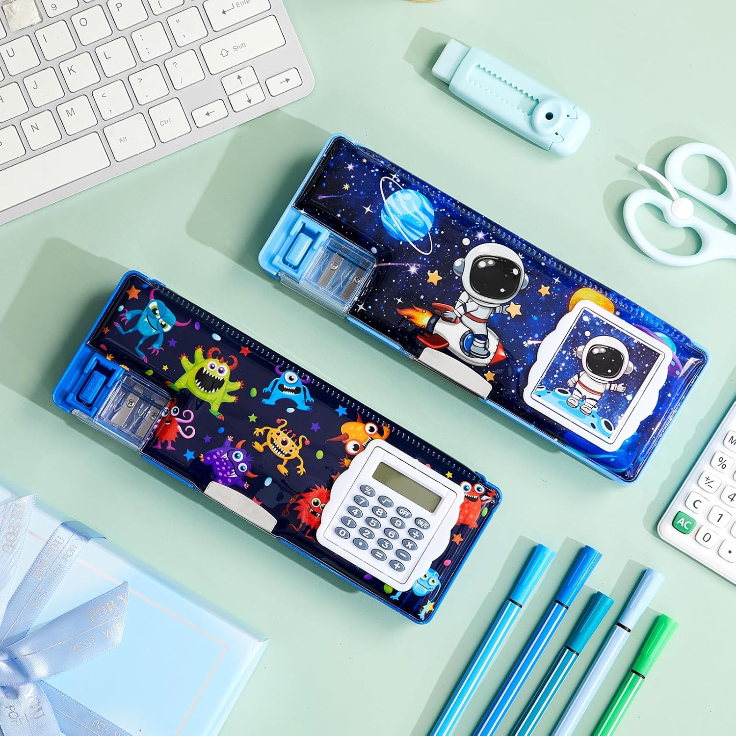 Henoyso 2 Pcs Multifunctional Pencil Box for Girls Cute Pencil Case Plastic Pencil Case with Calculator and Pencil Sharpener Pencil Pouch Gifts (Space, Microbes)