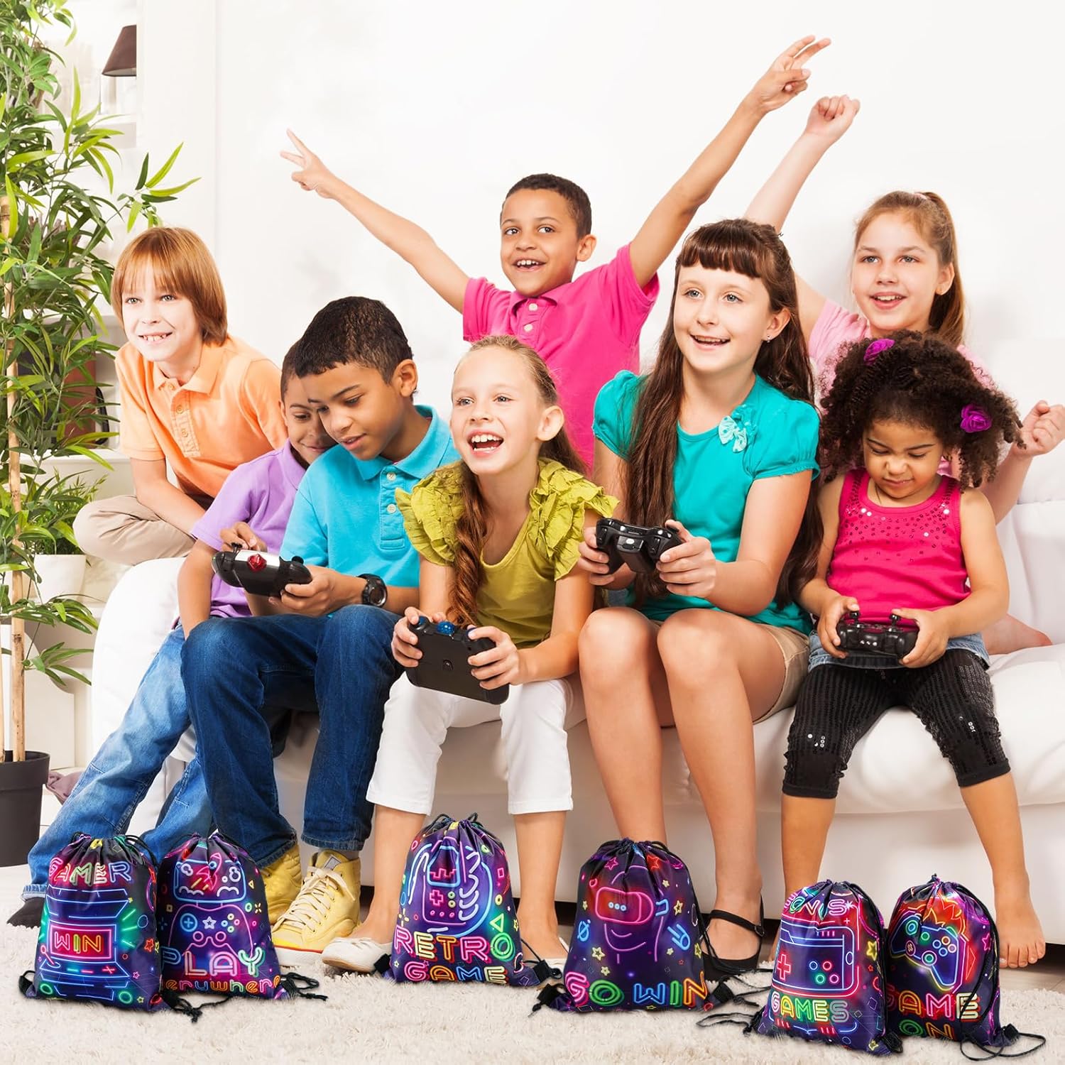 Huhumy 24 Pcs Video Game Party Favor Neon Game Drawstring Bags 12 x 10 Inch Video Theme Gifts Goodie Treat Candy Bags Party Supplies for Boys Girls for Kid Birthday