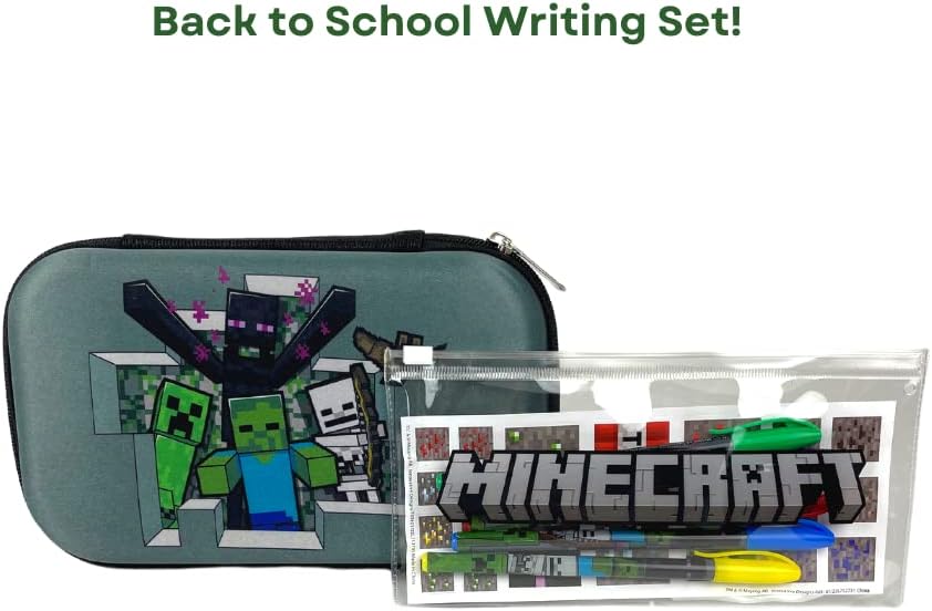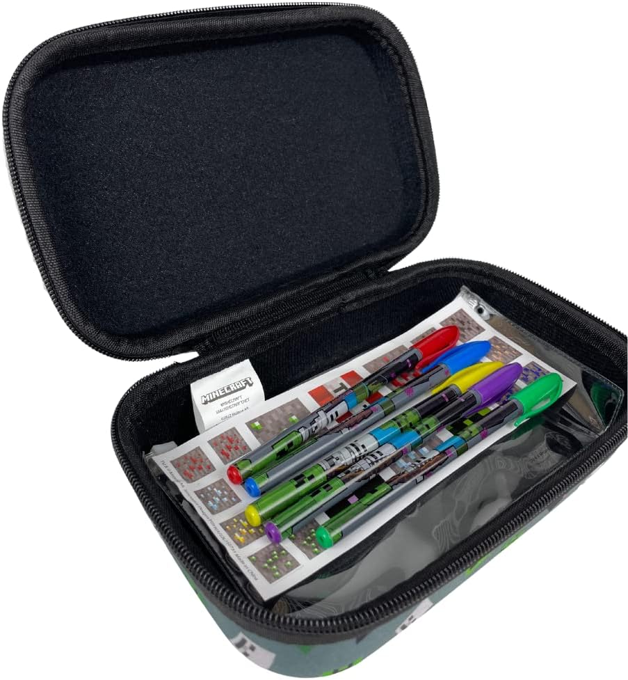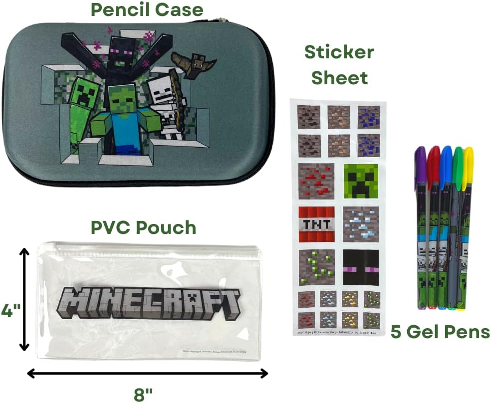 COMES WITH MINECRAFT STICKERS AND COLORED PENS – Featuring their favorite Minecraft characters, each set includes a clear zip pouch pencil case that fits inside the larger one, 5 colored gel pens, and a sticker sheet.