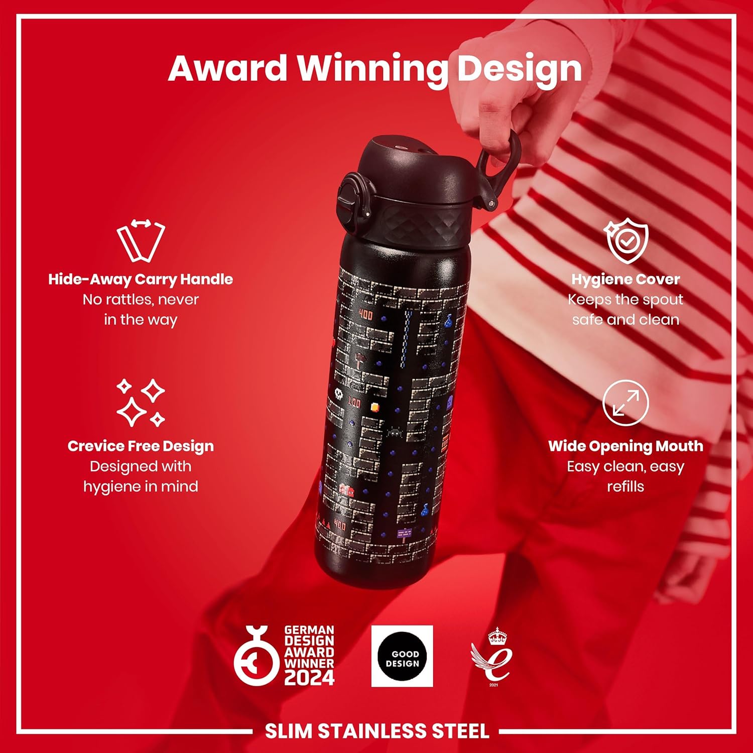 ION8 Steel Water Bottle, 600 ml/20 oz, Leak Proof, Easy to Open, Secure Lock, Dishwasher Safe, Flip Cover, Fits Cup Holders, Carry Handle, Durable, Scratch Resistant, Raised Print, Gaming Design