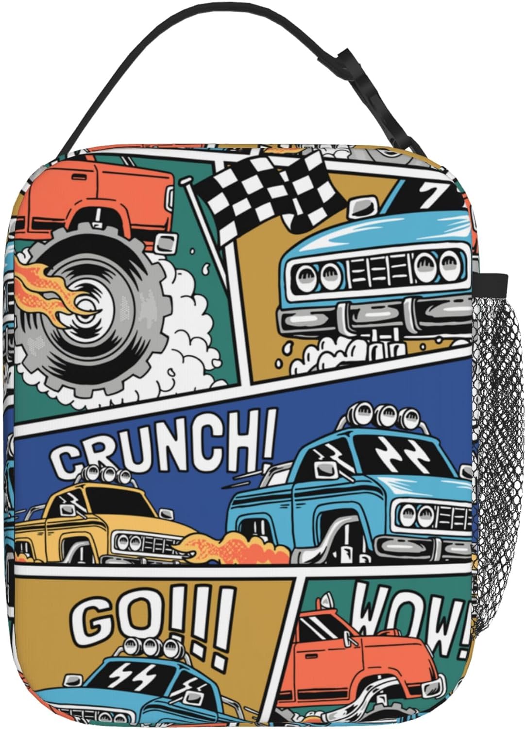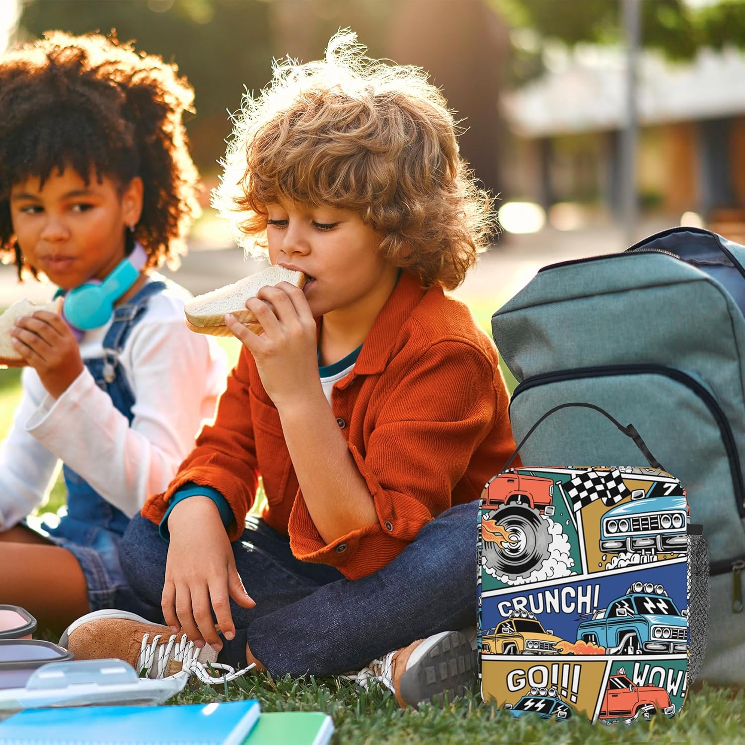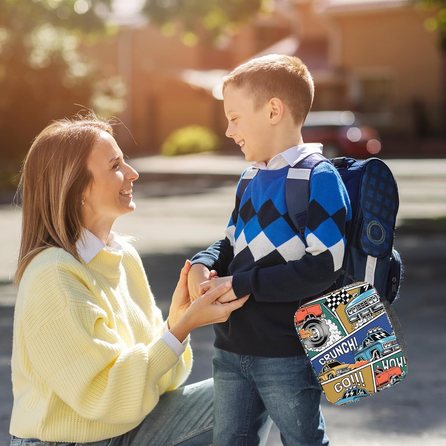 Kids Lunch Box Lunch Bag for Boys Men, Reusable Insulated Lunch Boxes Tote Bag, High Capacity Leakproof Thermal Cooler Sack Food Handbags for School Work Picnic Camping Gifts (Monster Trucks)