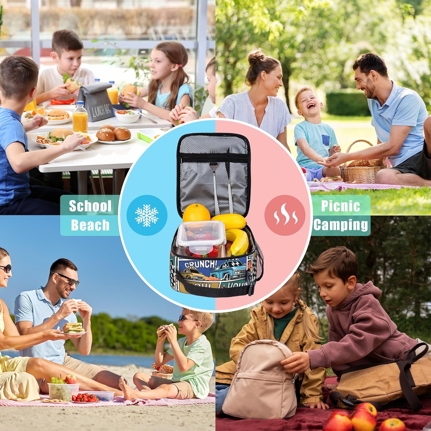 🚘【SUPERIOR MATERIAL】Reusable lunch bag, made of high-quality Oxford cloth, thickened mid-layer and food-grade PEVA lining, durable enough to keep food hot/cold for hours, and ease of cleaning, and activities for Ages 3+. Insulated lunch bag keeps your food/drinks at the optimal temperature. Cool graphic design, your child will be the most special at school using this YOZIRIBO lunch bag.