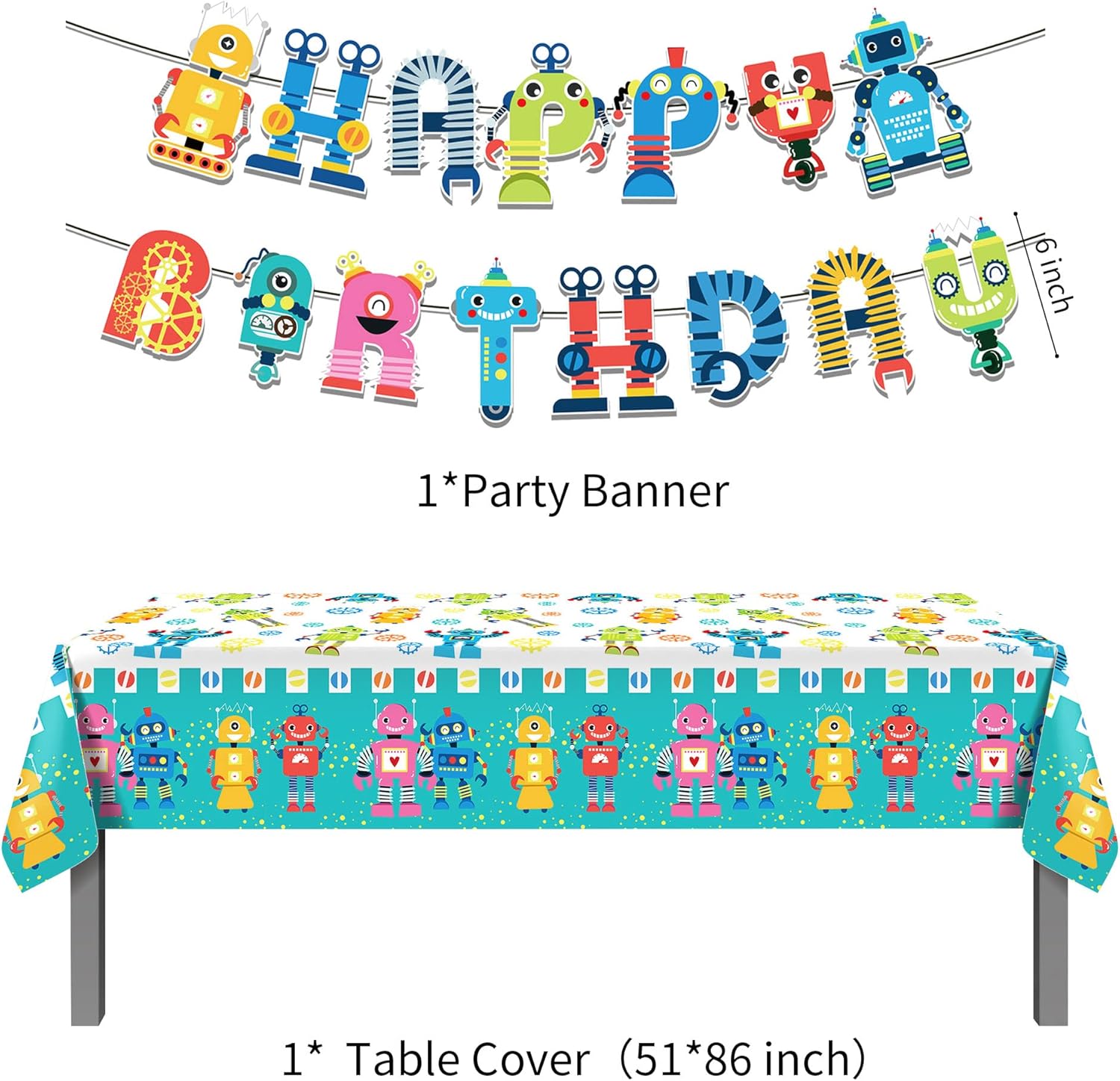 What you will receive:1 x Robot Birthday Banner, 8 x 9 inch robot plates, 8 x 7 inch robot plates, 8 x robot cups, 20 x robot napkins, 1 x robot tablecloth