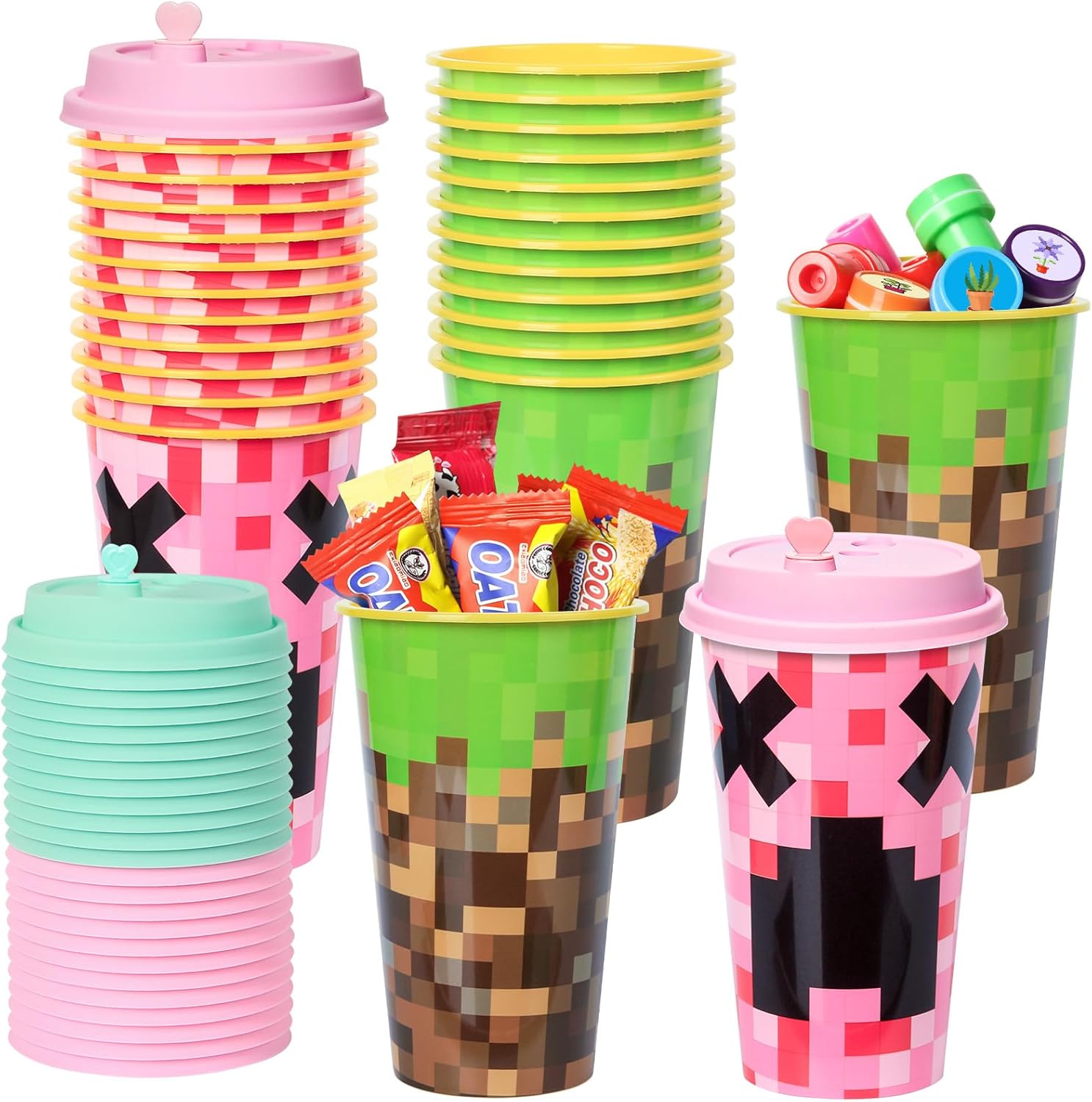 Lidmada Pixel Party Favors Goodie Cups, 24 Pack Birthday Party Cups in 2 Colors, 16OZ Reusable Pixel Game Themed Plastic Party Supplies Decorations Cups with Lids Plugs for Girls Kids Boys