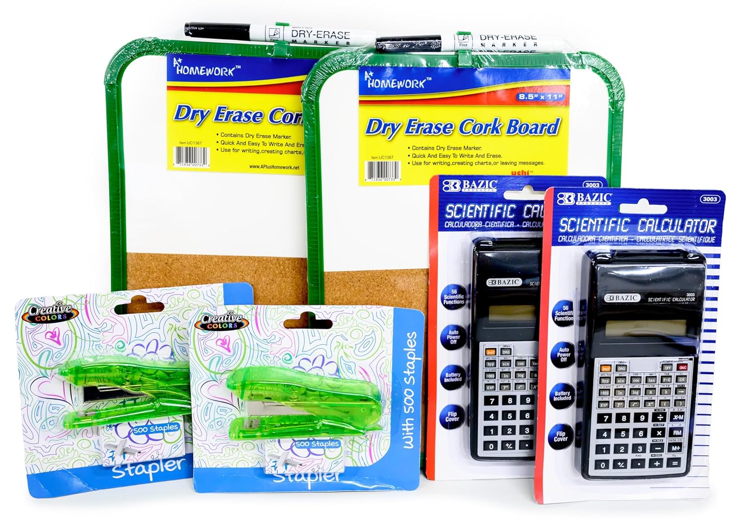 Additionally included: (2) Bazic scientific calculators, (2) 10-pack Crayola markers, (2) 12-pack Crayola colored pencils, (4) 10-pack wooden pencils, (2) 24-pack Crayola crayons, (2) 3-pack highlighters (blue/yellow/pink), (2) Elmer’s 4 oz glue bottles, (1) 50-count pencil cap erasers, (1) 200-count coated paper clips, (2) staplers, (2) Binder Pouches, (2) 5” blunt tip scissors, (6) BIC black pens, (6) BIC blue pens, (6) BIC red pens, (4) dry erase markers, (2) black Sharpie markers, (4) Elmer’s glue sticks, (2) handheld pencil sharpeners, (4) pink wedge erasers, and (8) pencil grips—everything your student needs for a successful school year!