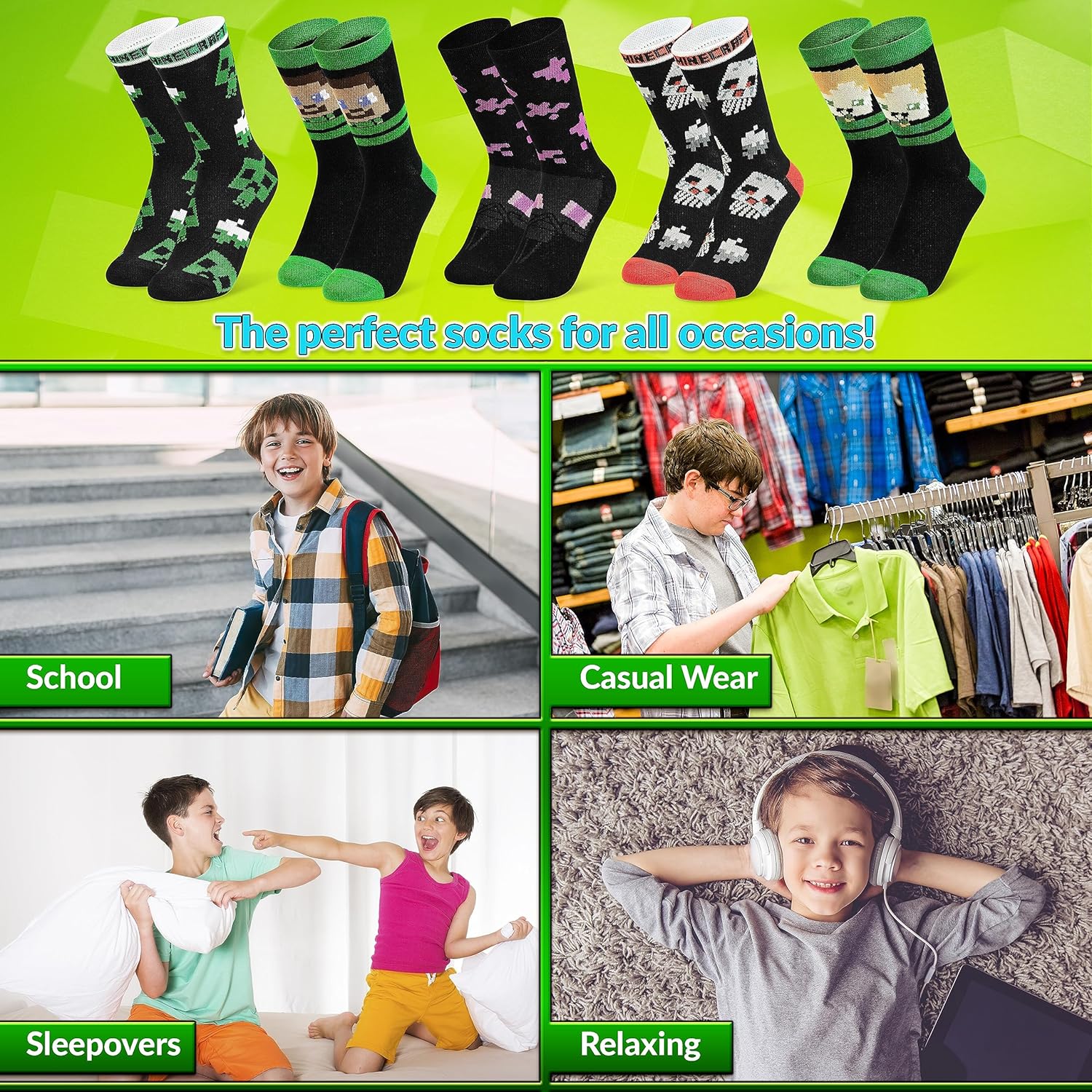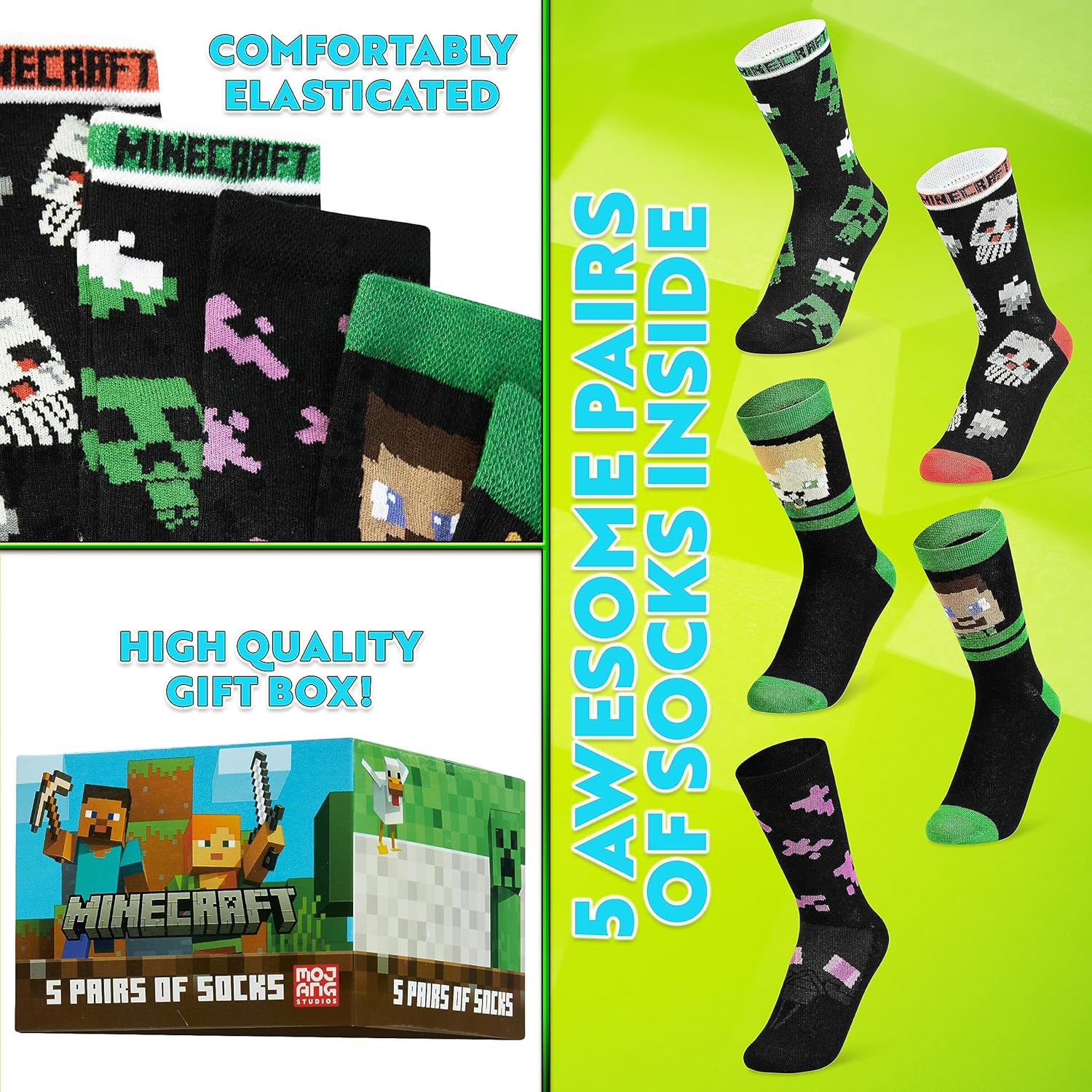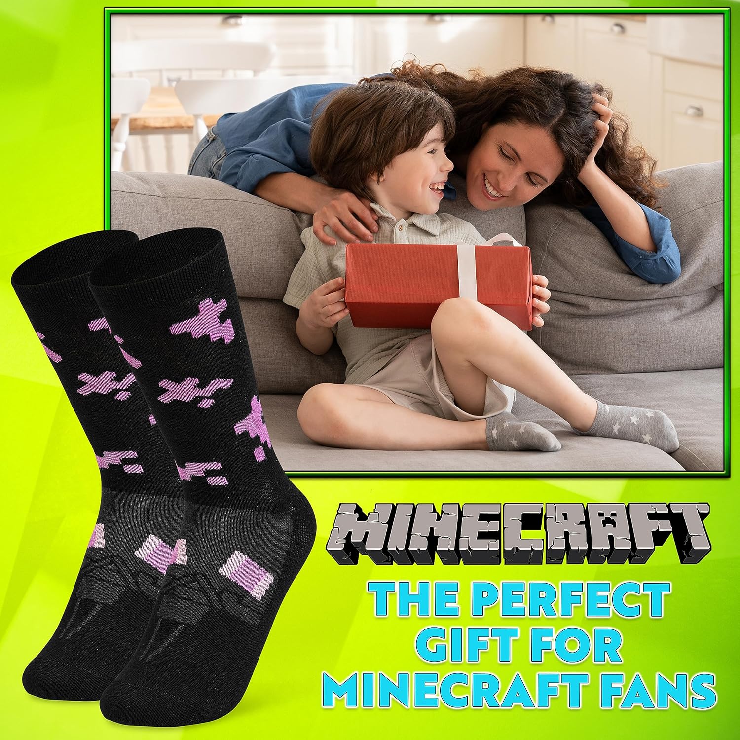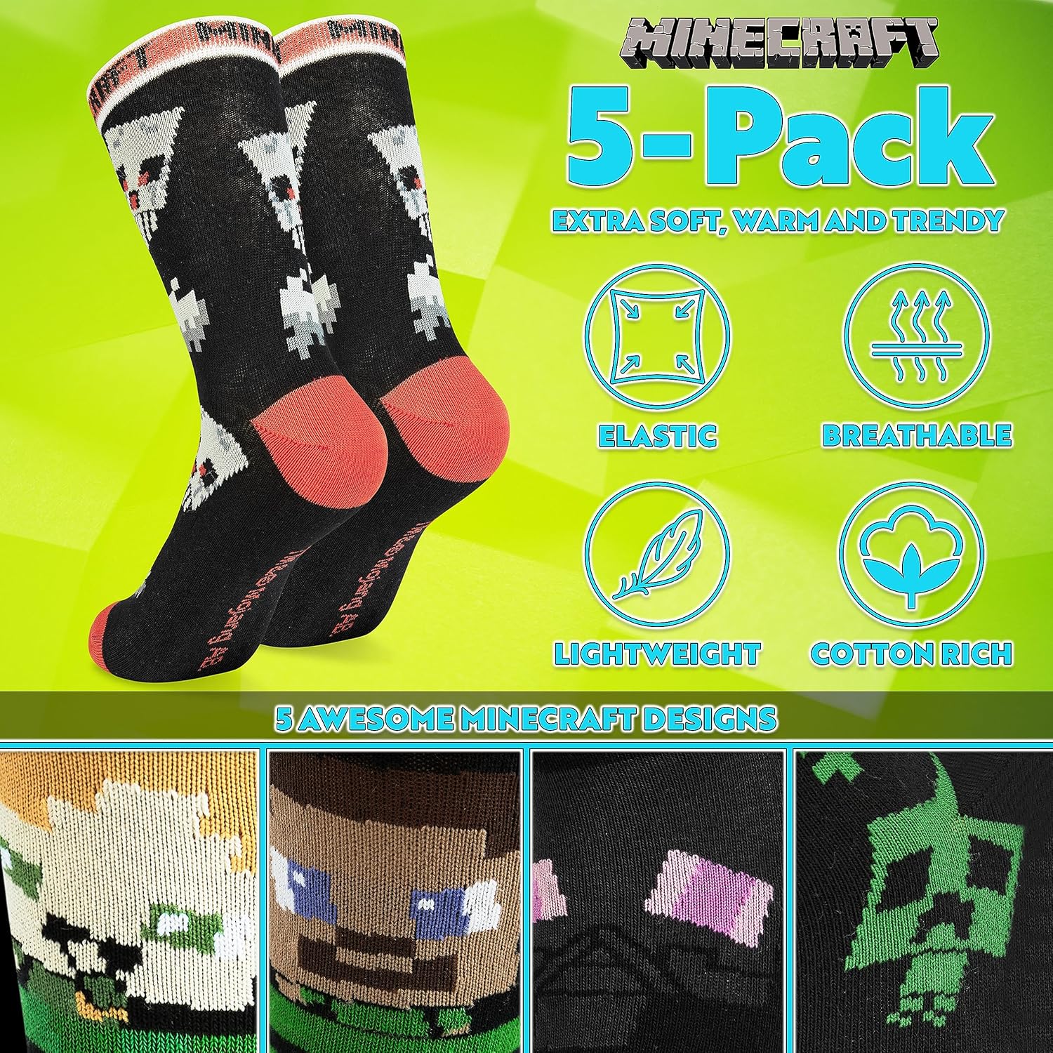 Minecraft Boys Crew Socks – Soft, Breathable Youth Socks Pack of 3 or 5 – Gamer Gifts