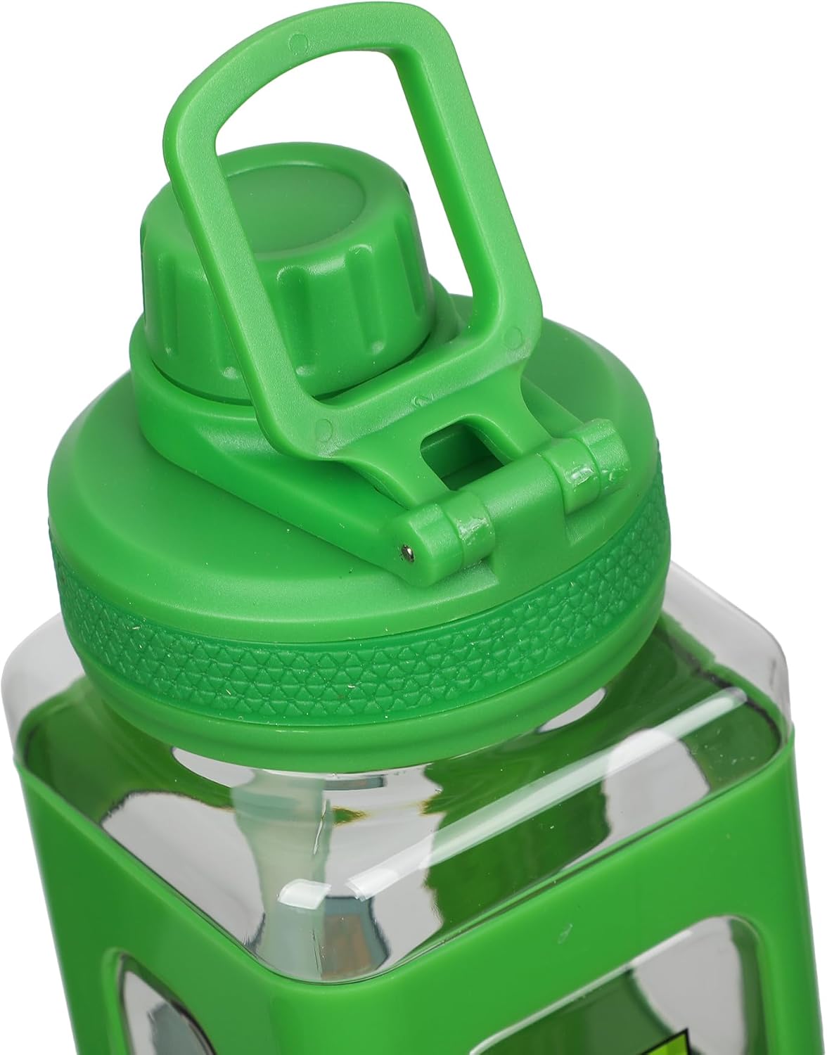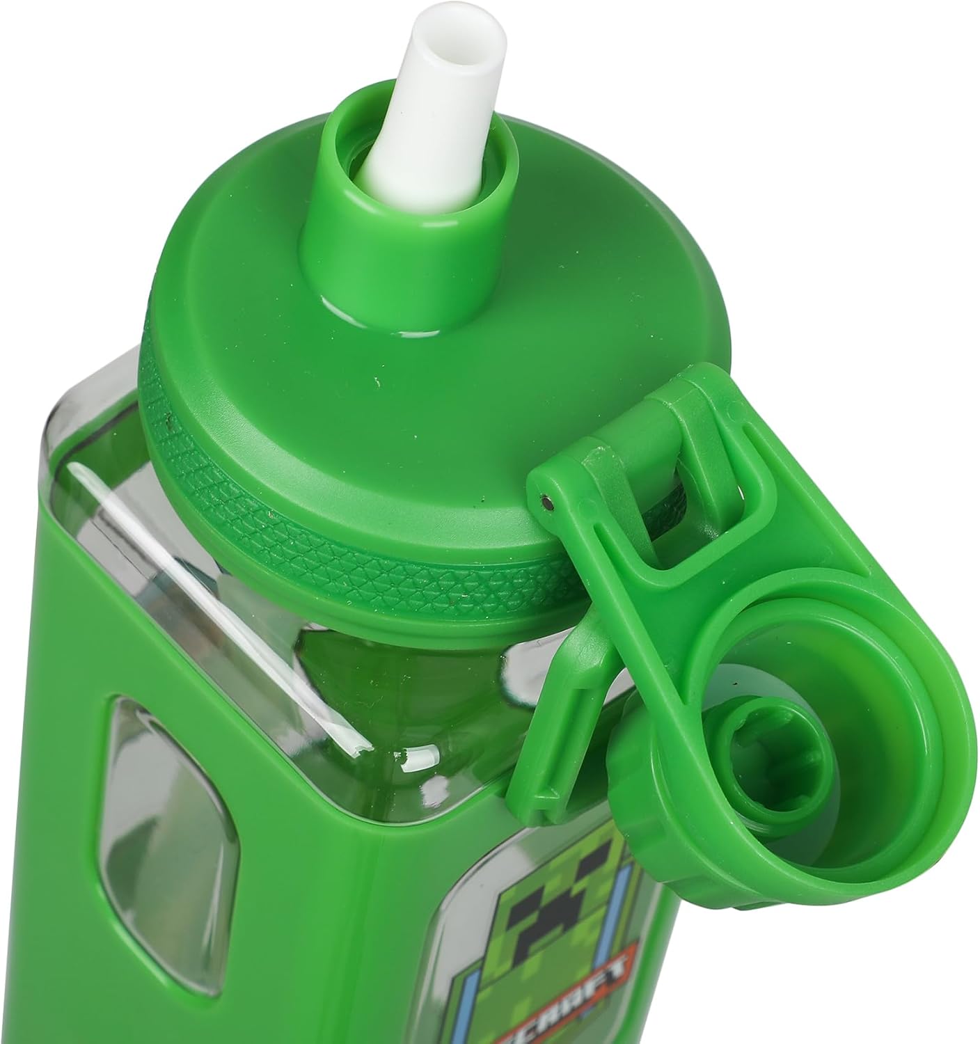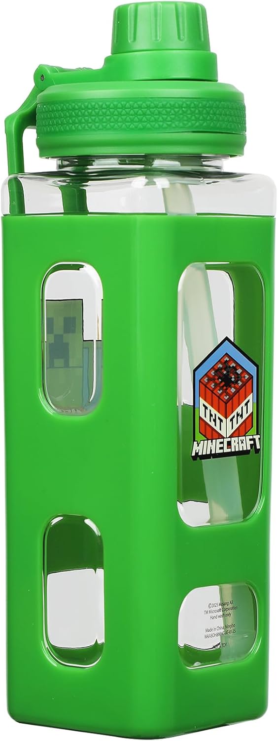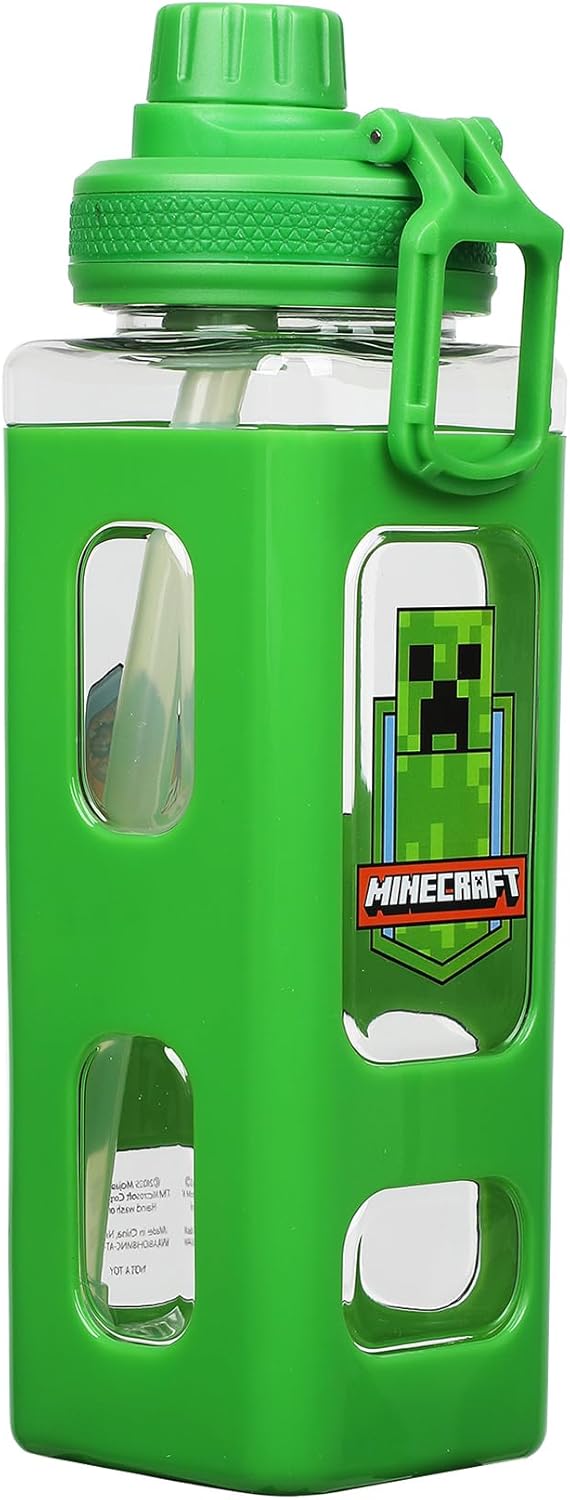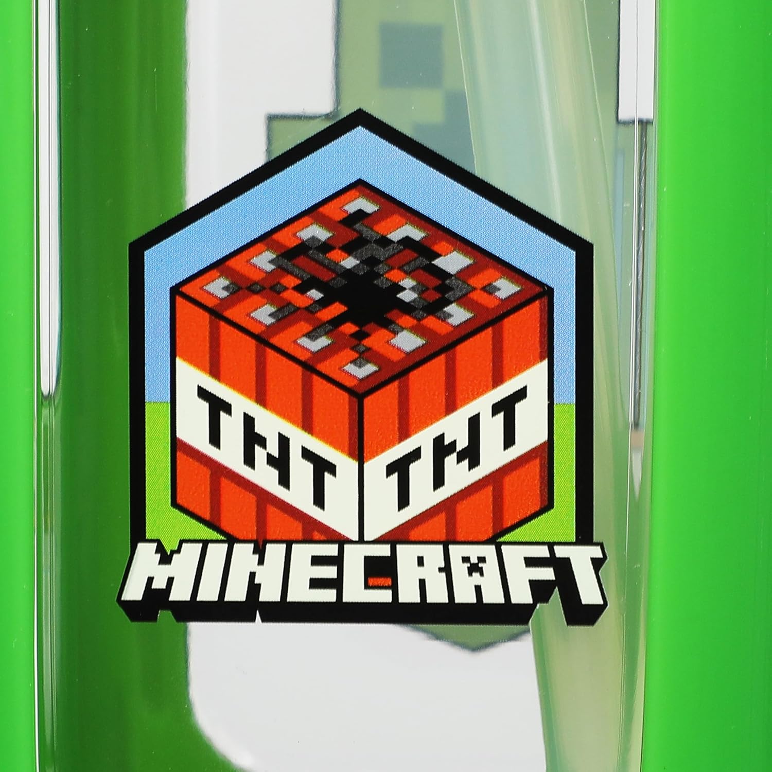 Stay hydrated in gamer style with this green Minecraft 24 oz plastic square water bottle. Featuring bold images of a creeper on one side and TNT on the other, this bottle brings the world of Minecraft to life. Its leakproof tight-fitting cap ensures mess-free portability, while its durable design makes it perfect for daily use. Measuring 2.72” D x 3.07” W x 9.13” H, this bottle is dishwasher safe on the top rack for easy cleaning.