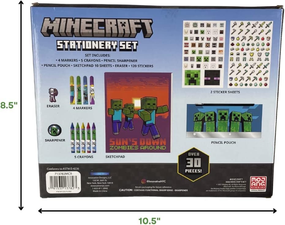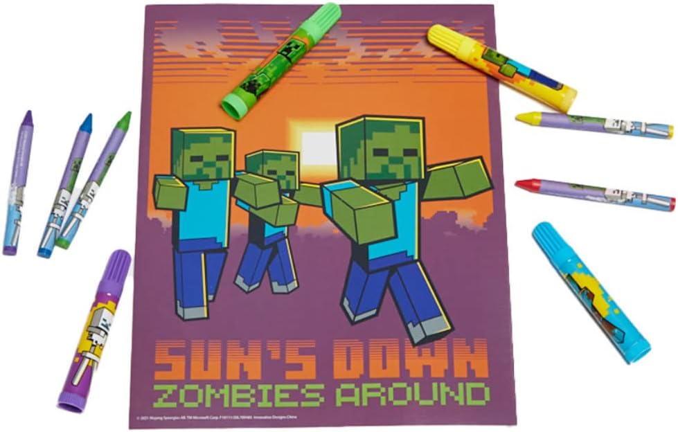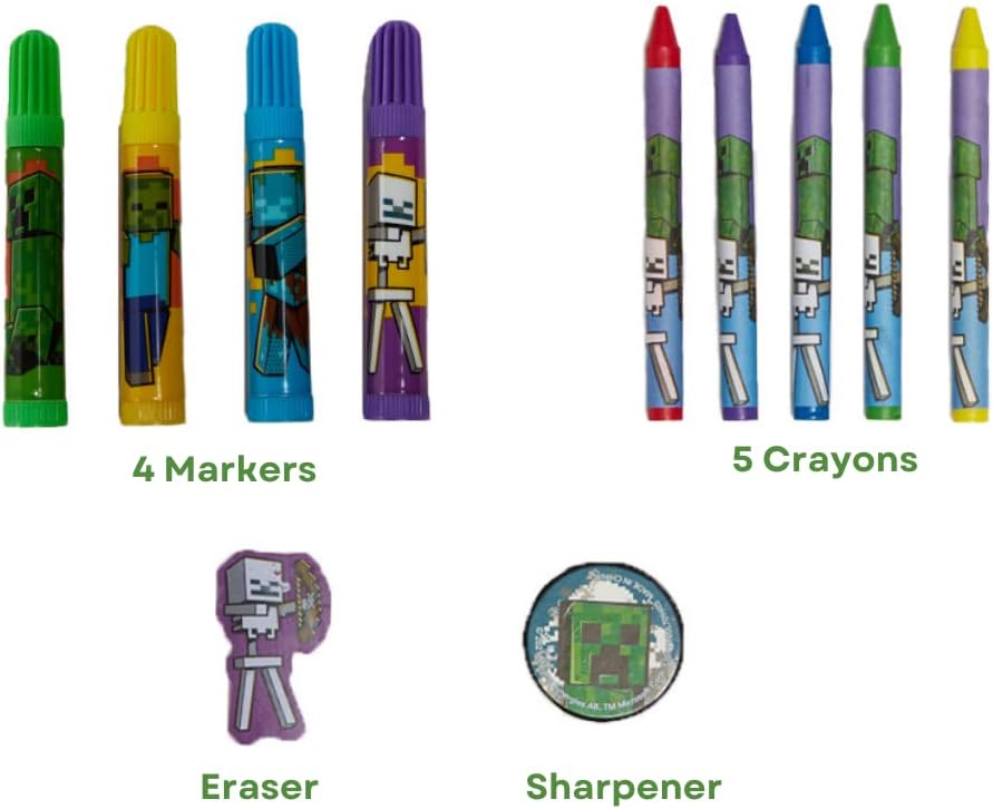 MINECRAFT ART GIFT SET – Our most popular kids’ art activity set, this complete 30 pc. Minecraft coloring art and school supplies set for kids includes 4 markers, 5 crayons, a soft pencil pouch case, a pencil sharpener, an eraser, a 10 piece sketchpad, and 2 sticker sheets.