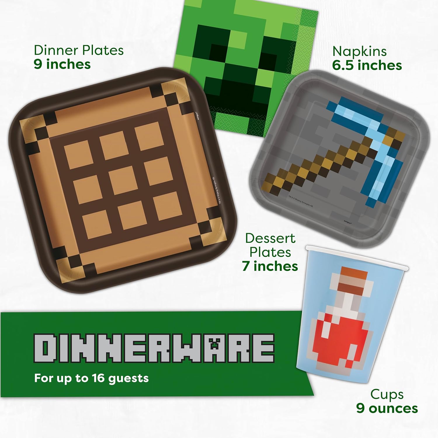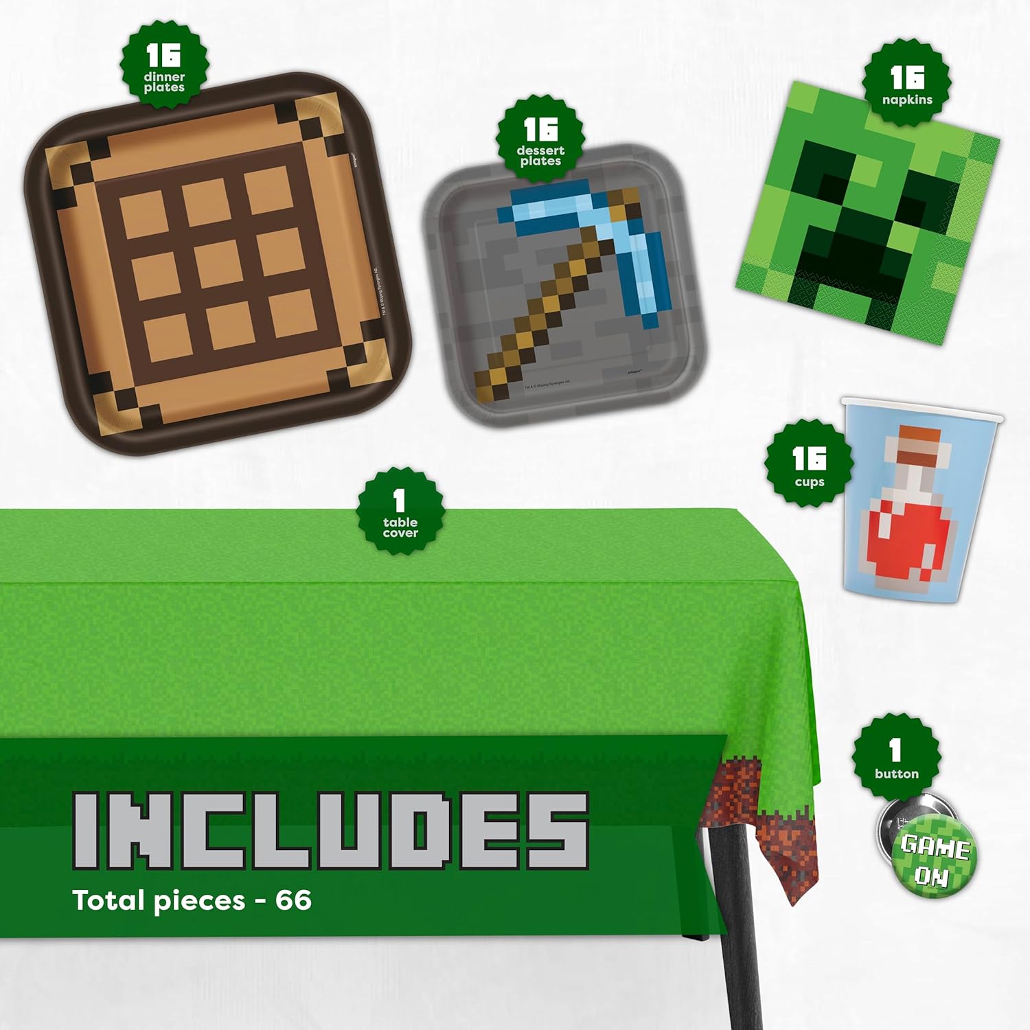 Minecraft Party Supplies | Minecraft Birthday Party Supplies | Serves 16 Guests | With Table Cover, Plates, Napkins, Cups and Button