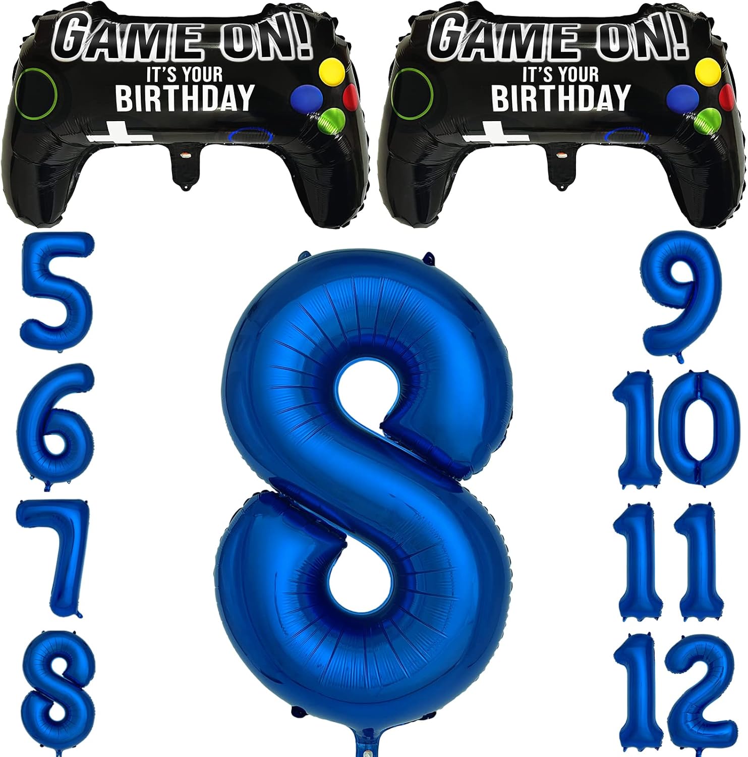 Game Birthday Decorations for boys: You will get two black game on controller mylar balloons, giant royal blue number balloons