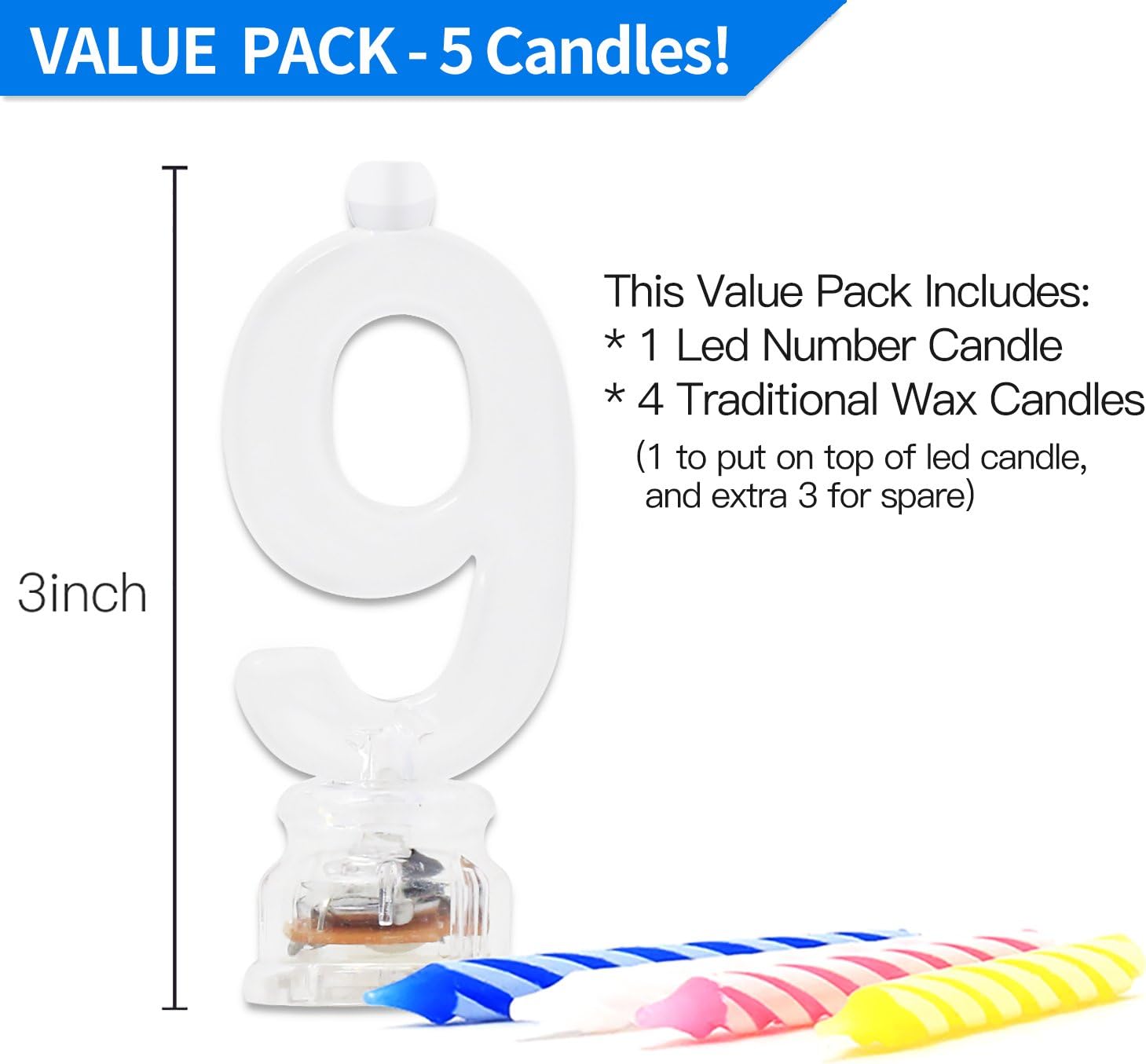 Novelty Place Birthday Number Candle Set, Flashing Multicolor Changing LED Birthday Cake Topper with 4 Wax Candles (Number 9)
