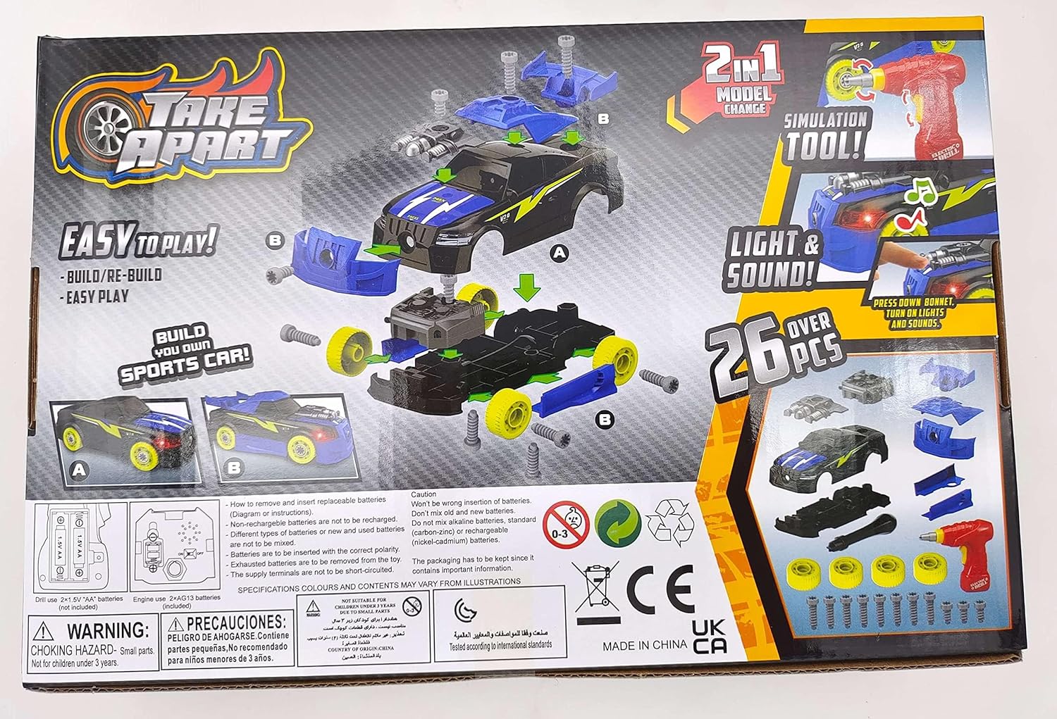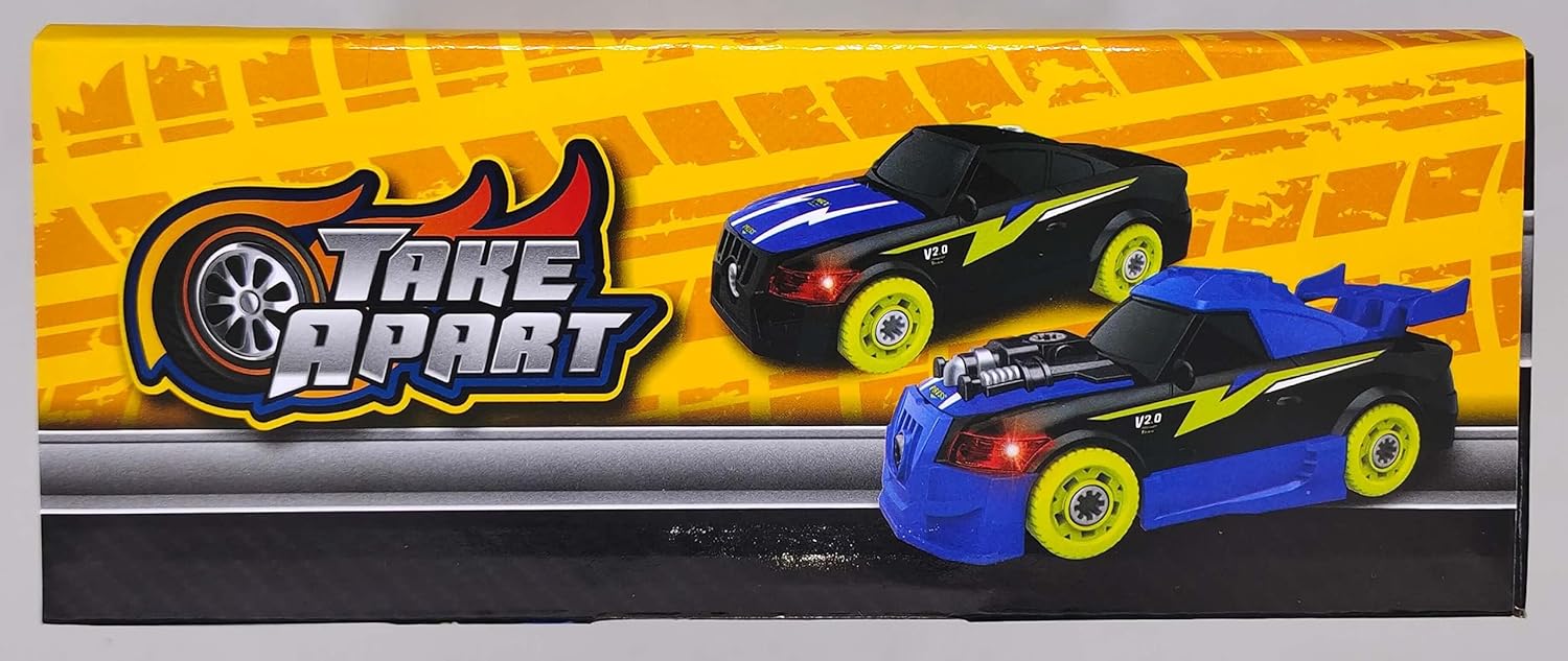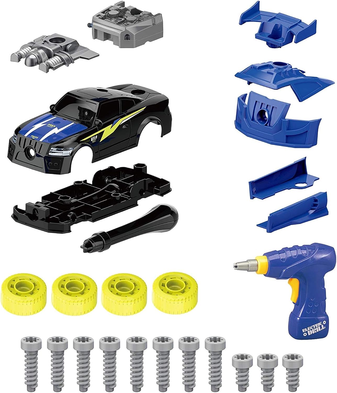 Detailed 26 piece take apart (4 Spare Screws Included)/ buildable car set including: 5 car parts, 5 modification parts, 4 tires, drill, drill bit and screws. Parts include engine, lights, roof, hood, side bumpers, spoiler, and front bumper. Large screws making them easy to use. Engine use 2x AG13 batteries (included) / Drill use 2x AA batteries (not included).